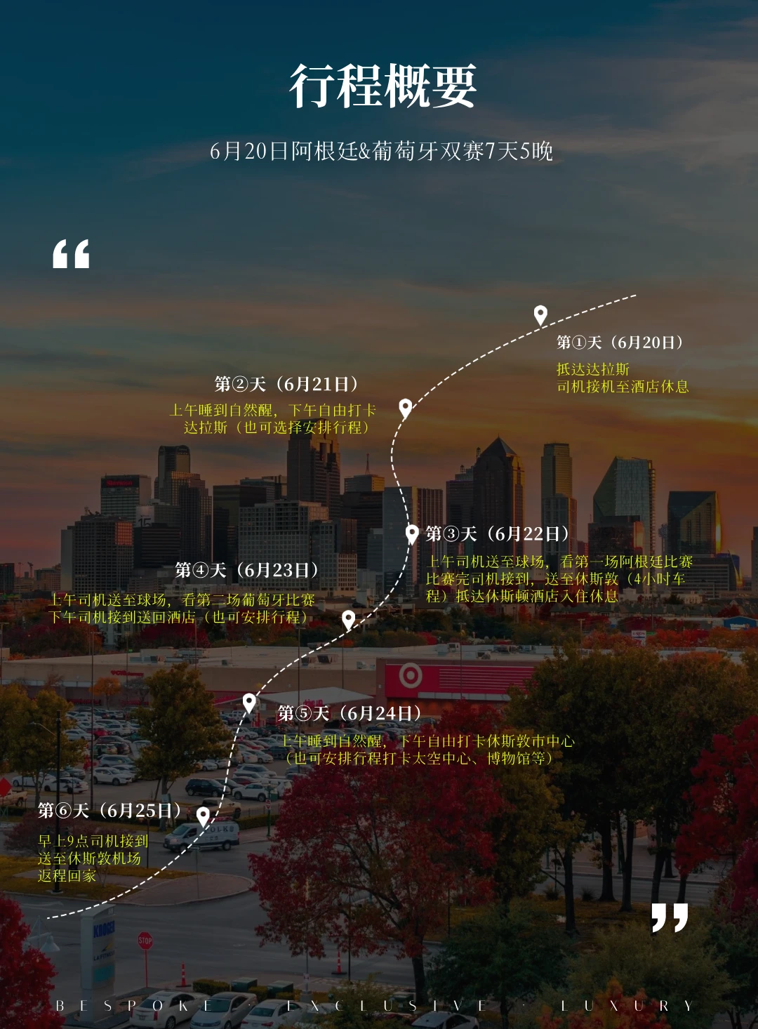 为了避免被GE!78为大家定制了一条性价比超高的行程,一个人3个W就能享受阿根廷和葡萄牙两场比赛,不管你喜欢梅西也好,还是C罗也好,都能兼顾!且且且!全程住希尔顿豪华酒店含早,全程7座商务车:接送机,比赛日接送,达拉斯到休斯敦(丰田赛那,正规经营车,严选3年内准新车)主打的就是一个舒心性价!