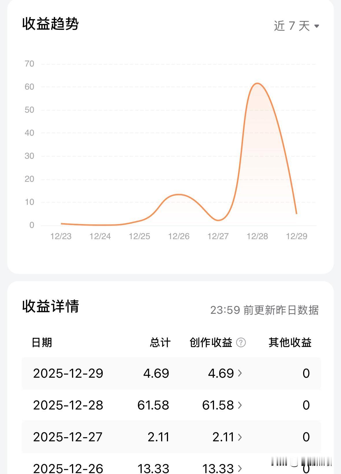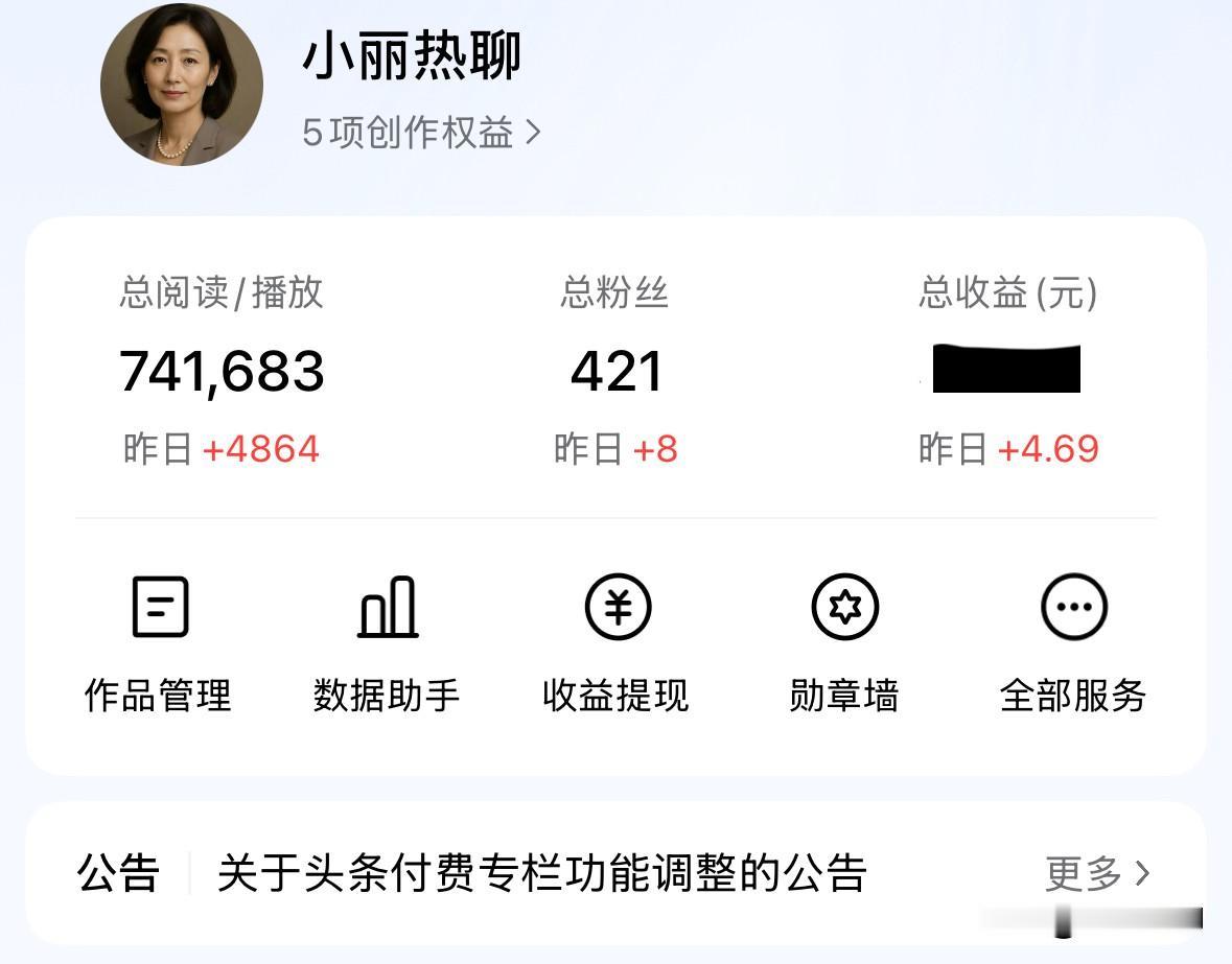 前天收益61元,真是过年了呀! 这两天有些忙,没怎么看收益情况,今天打开一看,前天竟然有61元的收益,昨天也有4块多,4000多的阅读量,竟然都4块了,千次阅读1块钱,这单价真的不错了。 可惜昨天和今天都没空好好写文章,今天的收益估计连块都上不了了。 还得努力写文章呀,最起码还能赚点饭钱,羊毛再少,能薅下来也行哈[大笑][大笑][大笑]