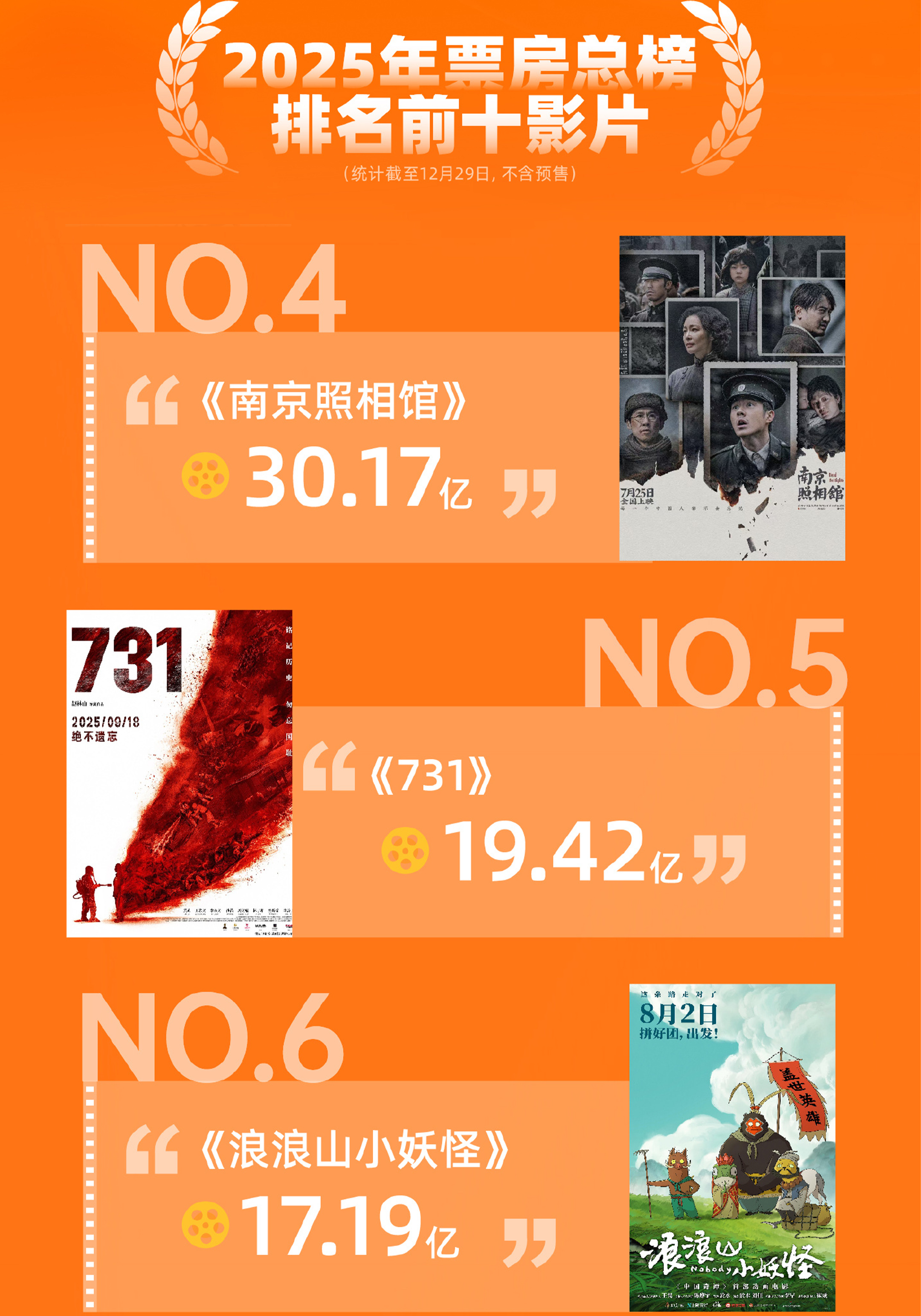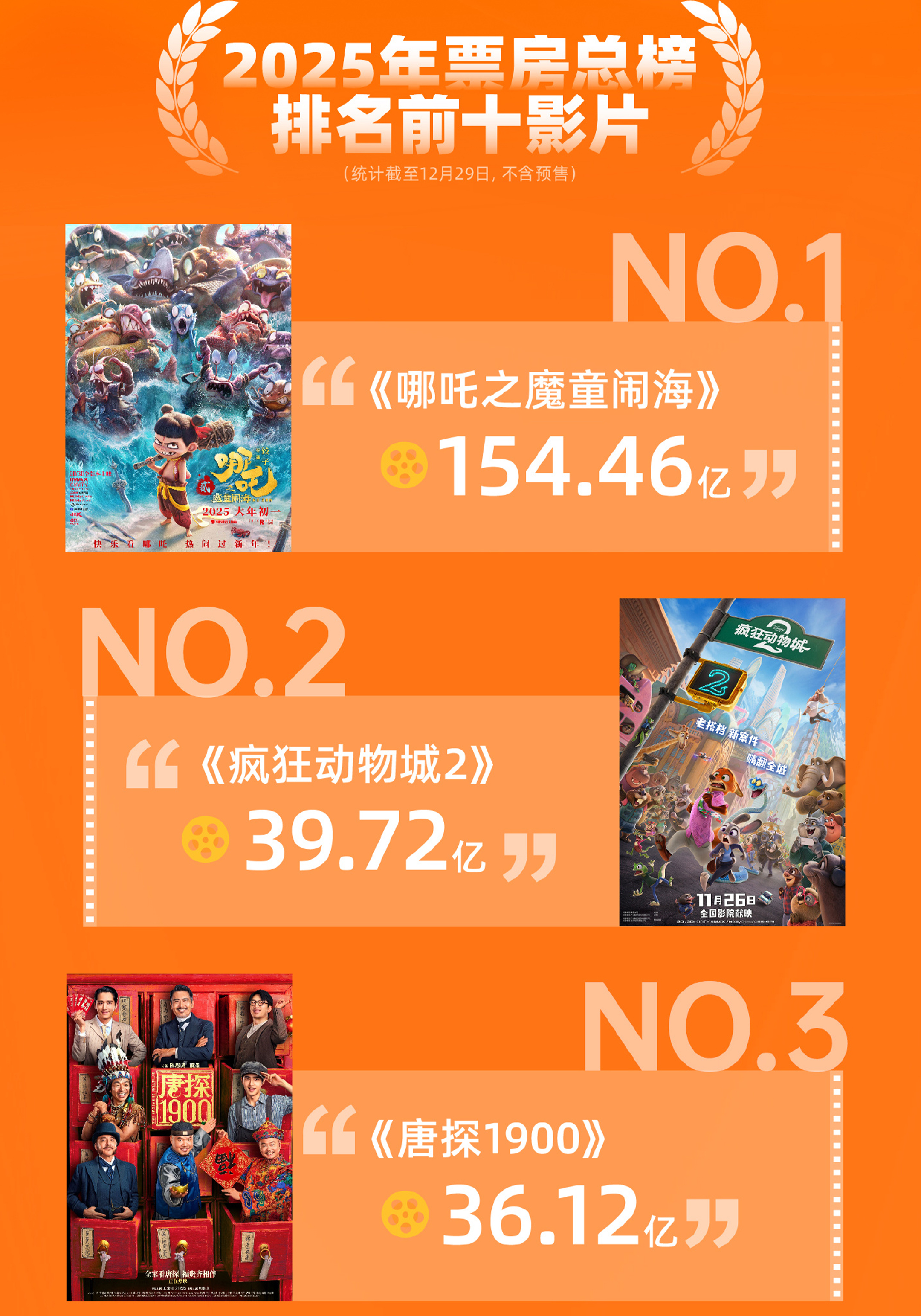 影视资讯|2025年国内市场电影票房排名榜TOP10:《哪吒之魔童闹海》154.46亿、《疯狂动物城2》39.72亿、《唐探1900》36.12亿、《南京照相馆》30.17亿、《731》19.42亿、《浪浪山小妖怪》17.19亿、《捕风追影》12.65亿、《封神第二部:战火西岐》12.38亿、《熊出没·重启未来》8.21亿、《阿凡达3》7.15亿,目前仅《疯狂动物城2》与《阿凡达3》尚在热映中,其余均已结束院线放映,你们最喜欢哪部呢?