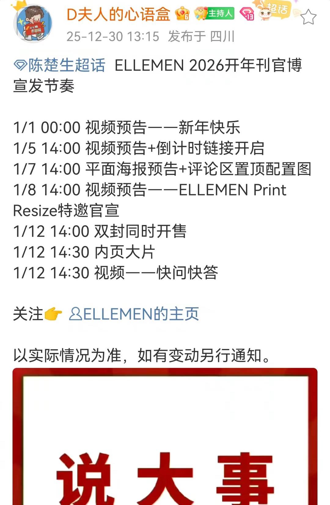 果然陈楚生的ELLEMEN!是邀封、是正刊、是双封、是开年刊! 好厉害啊,这绝对不是盖的,太重量级了。 花生们关注好超话,1月12日开售,准备好手速,24小时内付款,可以珍藏的一本杂志📓。