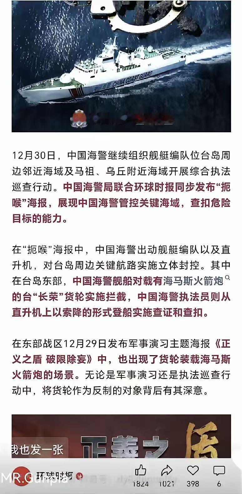 动真格了,震慑台独的一记重拳。 大陆海警台岛东部海域直升机索降查扣载有老美对台军售装备的长荣号货船。 海警直升机索降登船,当着全世界的面查扣军售货轮,这力度、这决心,看得人热血沸腾! 之前12月18日,特朗普政府批准了111亿美元的对台军售,创下历史之最,里面就包括杀伤力极强的“海马斯”火箭炮、自杀无人机这些大杀器。赖清德当局还欣喜若狂,以为抱到了“大腿”,殊不知这是在往分裂的火坑里跳。 而这次被查扣的“长荣”号货轮,更是有点“吃饭砸锅”的意思。这家企业一半利润都来自大陆市场,创始人曾明确说“台湾人也是中国人”,可 recent 却一再触碰底线:拒绝和大陆船厂合作,旗下酒店拒挂中国国旗,如今还主动承接美台军售运输任务,之前就运过M1A2T坦克,这次更是胆大包天载着“海马斯”火箭炮! 12月30日,福建海警在台岛东部海域开展常态化管控时,盯上了这艘问题货轮。只见直-9直升机盘旋上空,执法人员果断索降登船,一套动作干净利落,当场查扣了船上的违规军售装备,海警发布的“扼喉”海报更是直接亮明态度——敢越红线就必查必究! 可能有人会问,咱们这么做有依据吗?当然有!《中华人民共和国海警法》早就明确规定,海警有权制止危害国家主权的行为,面对紧迫危险时甚至可以使用必要措施。台岛东部海域不是“法外之地”,以前某些人觉得这里是“安全通道”,现在彻底被打破了,咱们的管控已经覆盖台海全域! 这事儿看着是查扣一艘货轮,实则意义重大。 对“台独”势力来说,这是狠狠的敲打——以为靠买几件美国武器就能“以武拒统”?纯属白日做梦,运输链都能给你掐断! 对外部干涉势力来说,这是清晰的警告——台海事务是中国内政,任何国家都无权插手,军售输送这条路走不通了! 国家统一是大势所趋,民心所向,任何分裂行径、任何外部干涉,都挡不住两岸同胞走向团圆的脚步。这次海警的行动,就是维护和平、震慑分裂的正义之举! 你觉得这次查扣行动能给“台独”势力多大震慑?欢迎在评论区说说你的看法。