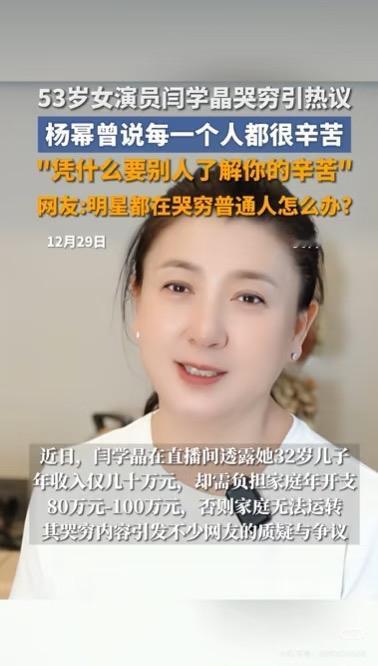 闫学晶直播说儿子年收入仅几十万。她儿子32岁,中戏毕业当演员,一年就接一部戏挣20到30万,儿媳是音乐剧演员收入不高,两口子加起来一年不到40万。可北京家里养孩子、还房贷这些开销,一年得80到100万,确实不够用。 但网友觉得这有点离谱,普通人一年挣3万多,闫学晶儿子一部戏的钱够人家干五六年。再说闫学晶自己直播带货挣不少,三亚有豪宅,儿子结婚时还开劳斯莱斯车队,这哪像穷的样子。 你们说,这到底是真不够花,还是对“普通生活”的标准定得太高了?