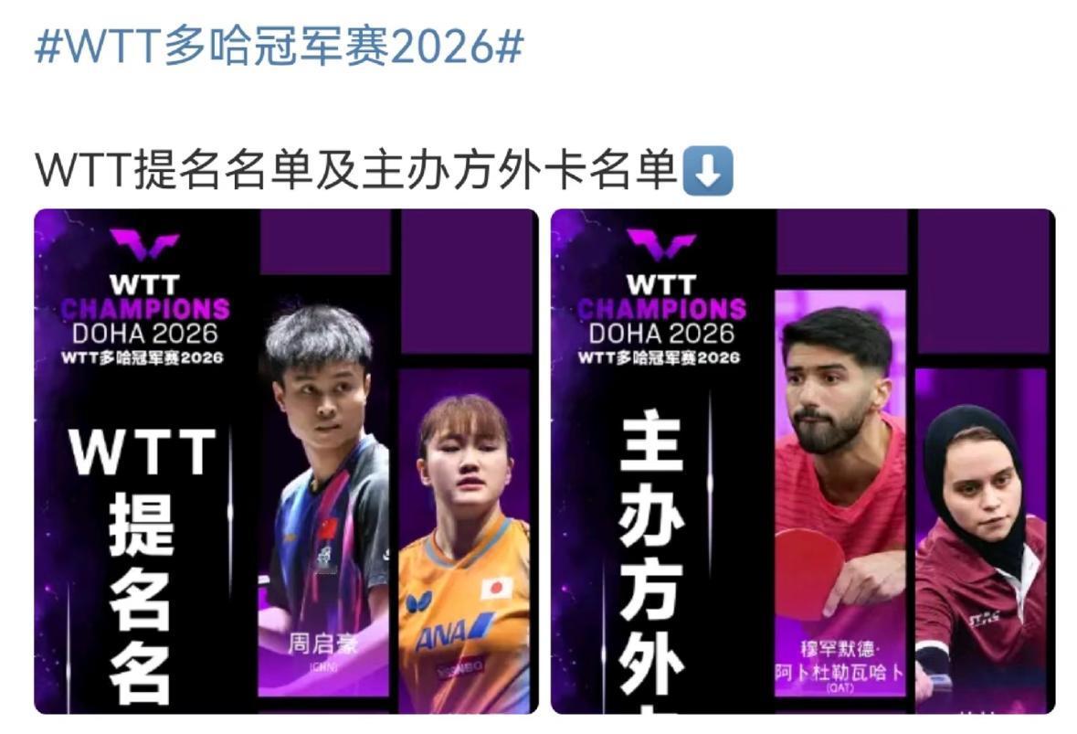 WTT多哈冠军赛提名周启豪和大藤沙月 多哈冠军赛国乒参赛名单: 男单:林诗栋 梁靖崑 向鹏 陈垣宇 周启豪 女单: 王曼昱,蒯曼,陈幸同,王艺迪, 陈熠 莎莎退赛, 王楚钦没报名, 这次周启豪获得提名太好了。 国乒男队增加了力量, 周启豪参赛机会还可以, 有实力,但看电量🔋…… 发挥稳定的话,说不定 还能参加伦敦世乒赛呢! 大藤扣去蒙彼利埃的1000积分后, 排名就掉下来了, 在日乒排第五, 冠军赛限四, 日乒和国乒一样卷, 国乒有奥运冠军名额不算, 女单至少可以参加六人! 希望周启豪多参加比赛, 好好发挥吧!