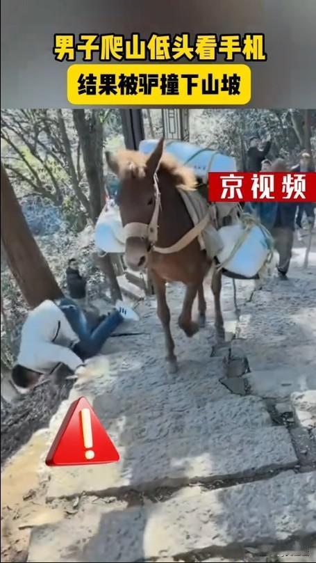 原谅我不厚道的笑了!刷到个杭州爬山的视频,一男子低头盯着手机爬山,愣是没注意后方过来的驮货骡子(视频里写的驴,实际看着是骡子),直接被骡子驮着的货物挤倒,往旁边的山坡滚,整个人倒栽葱似的摔下去,看着都替他捏把汗,但又忍不住笑出声。 爬山本来就得盯着脚下的路,更何况是有运货牲畜的山路,还低头刷手机,这心也太大了。希望大哥没摔出啥大问题,也算是给大伙提个醒,出门在外尤其是走山路,可别光顾着玩手机,安全才是第一位的啊!