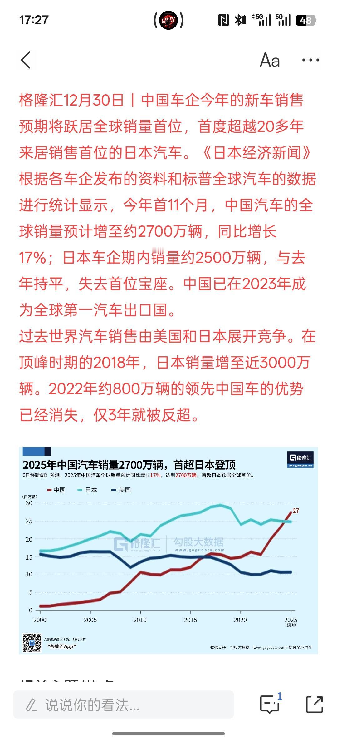 中国2025年汽车销量首度超越日本 跃居全球第一,日本估计有点不知所措了,日本本以为傲的汽车产能在全球占据了很大的市场,尤其是丰田,常年在全球销量榜是排名第一,也是日本比较有实力的汽车行业,而且日本汽车销往全球,现在中国在新能源汽车领域的弯道超车显然已经超越了日本,而中国的新能源汽车出口在逐步增长! 那随着中国新能源汽车持续的创新发展,在自动驾驶时代的到来以及智能驾驶时代的发展趋势,那中国未来还会持续在新能源汽车出口出现大规模的增长趋势!欧洲市场会有大量的中国新能源汽车!