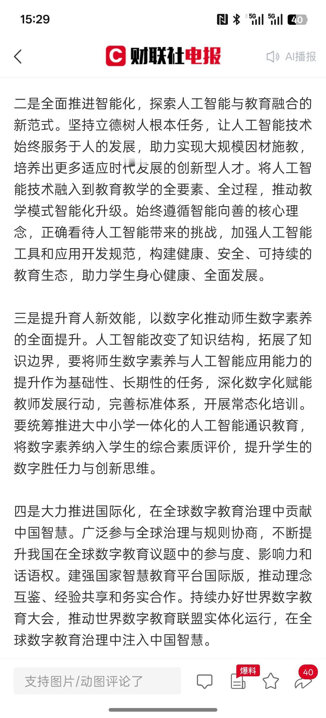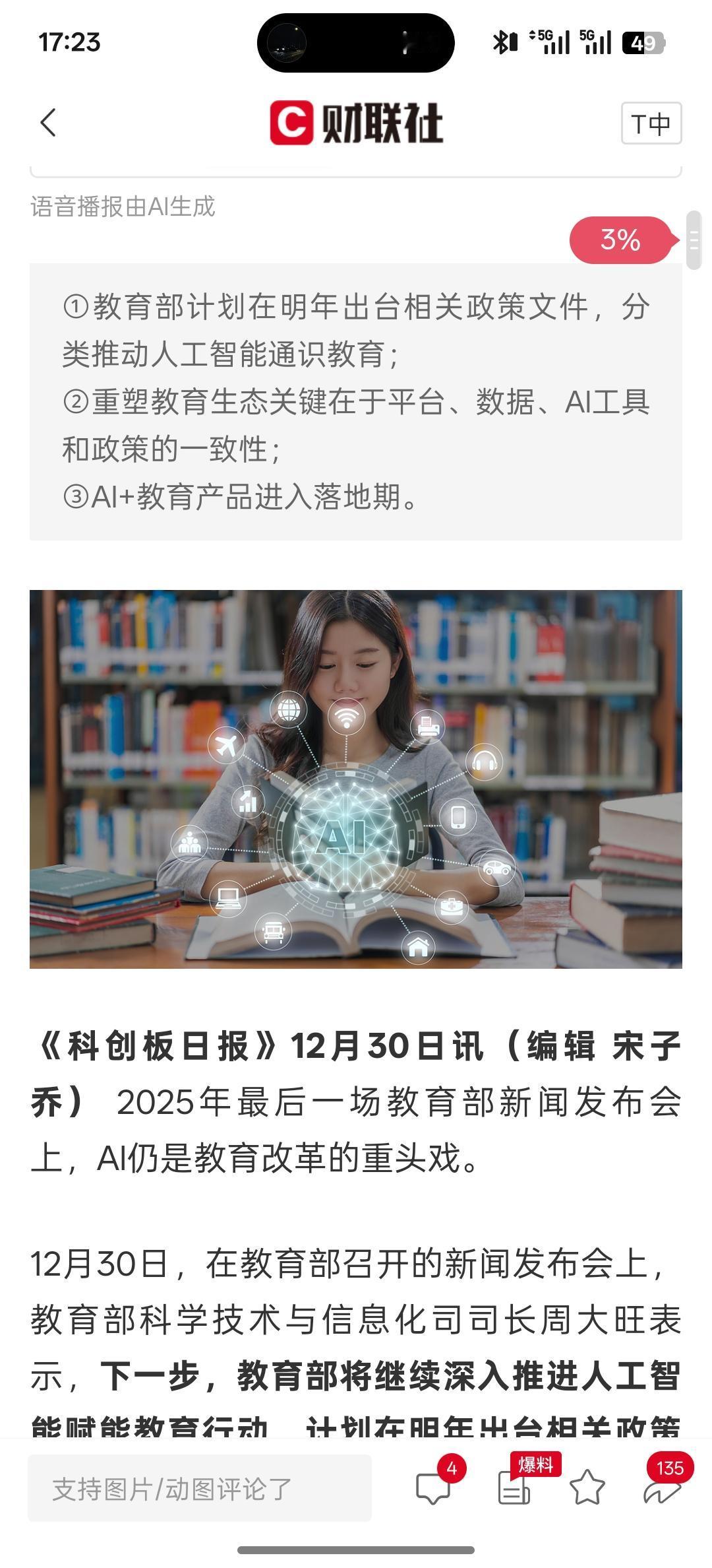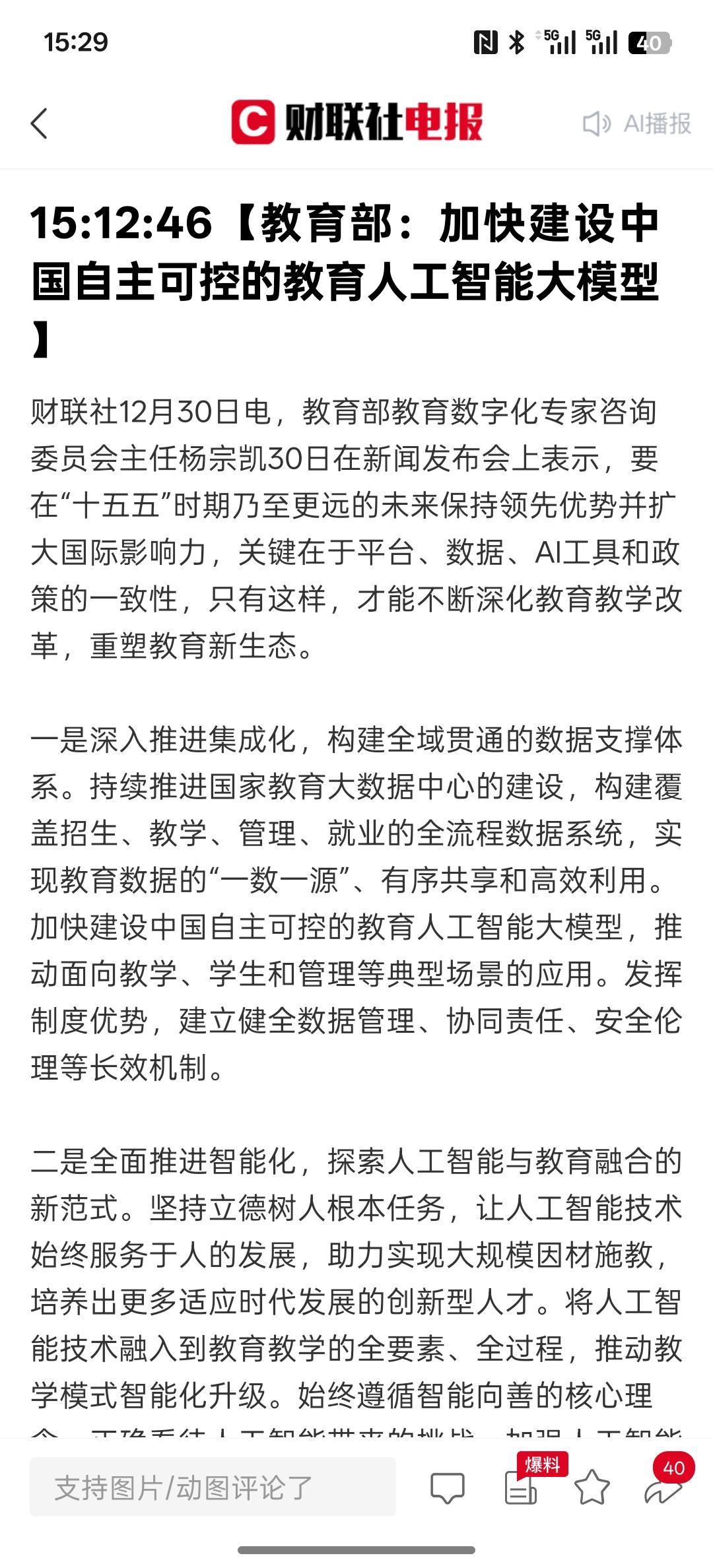 AI+教育支持发展,教育部:计划明年出台人工智能赋能教育相关政策文件 系统部署推进人工智能教育和应用,这对于人工智能来发展又是一个重大的应用场景发展落地!这是要推动AI人工智能在各行各业的应用场景发展。人工智能对教育智能化程度会越来越大!那以后很多学校都会使用到AI人工智能,可以培养更多高素质的人才!教育也会数字化,教育行业利用AI人工智能,这个工具可以培育更多的高科技人才,拥有更多知识!人人工智能可以提供海量的知识与学习能力!教育数据中心的建设也会加入AI人工智能!发展的教育AI人工智能大模型!人工智能融入教育是必然的趋势!