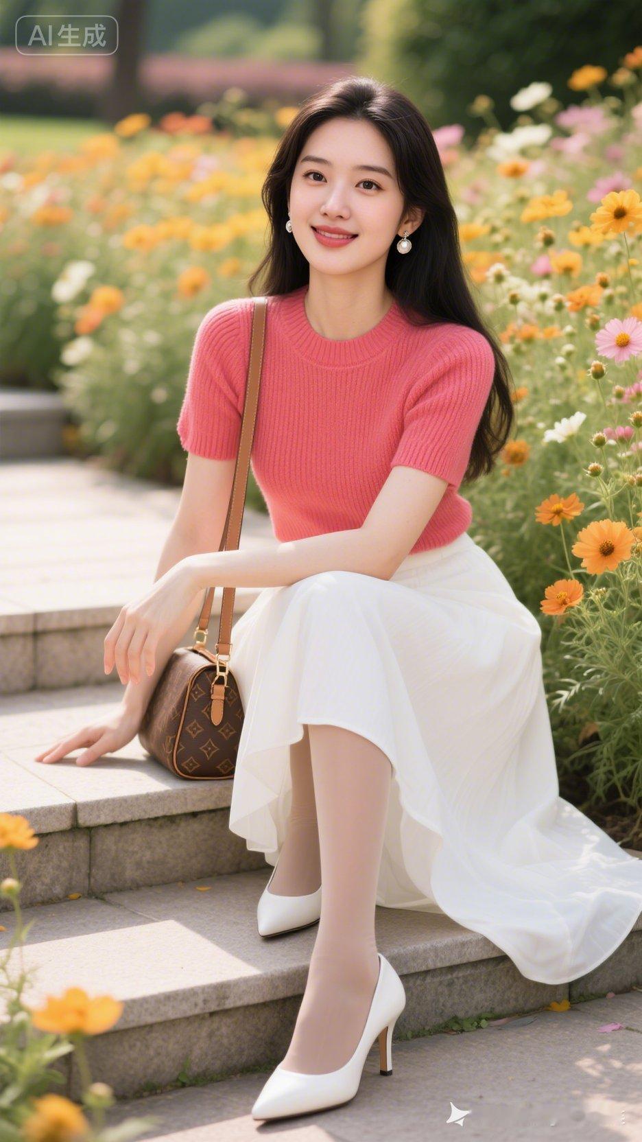 甜美少女风穿搭,粉色毛衣+白色长裙,花海中的优雅时光!