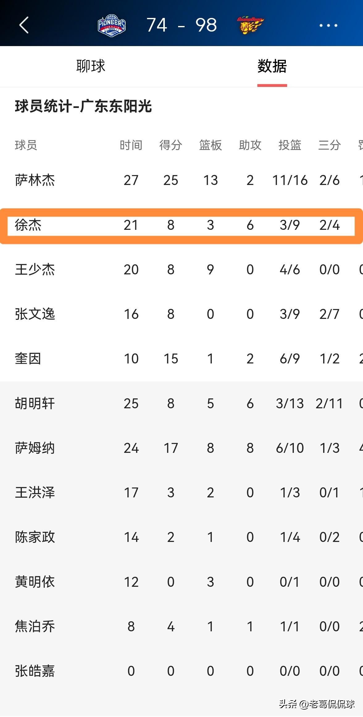 广东东阳光控卫徐杰终于发挥失常了!在今天广东东阳光客场以98:74大胜天津先行者的比赛中,徐杰十分罕见的发挥失常,他在首发出战的21分钟里,投篮9中3,其中三分球4中2仅仅得到8分,不过有3篮板6助攻,他的场上正负值为+7。 老实说,以徐杰目前的得分能力来看,只要他想得分,他的得分可以轻松上双,今天的徐杰确实不常见。