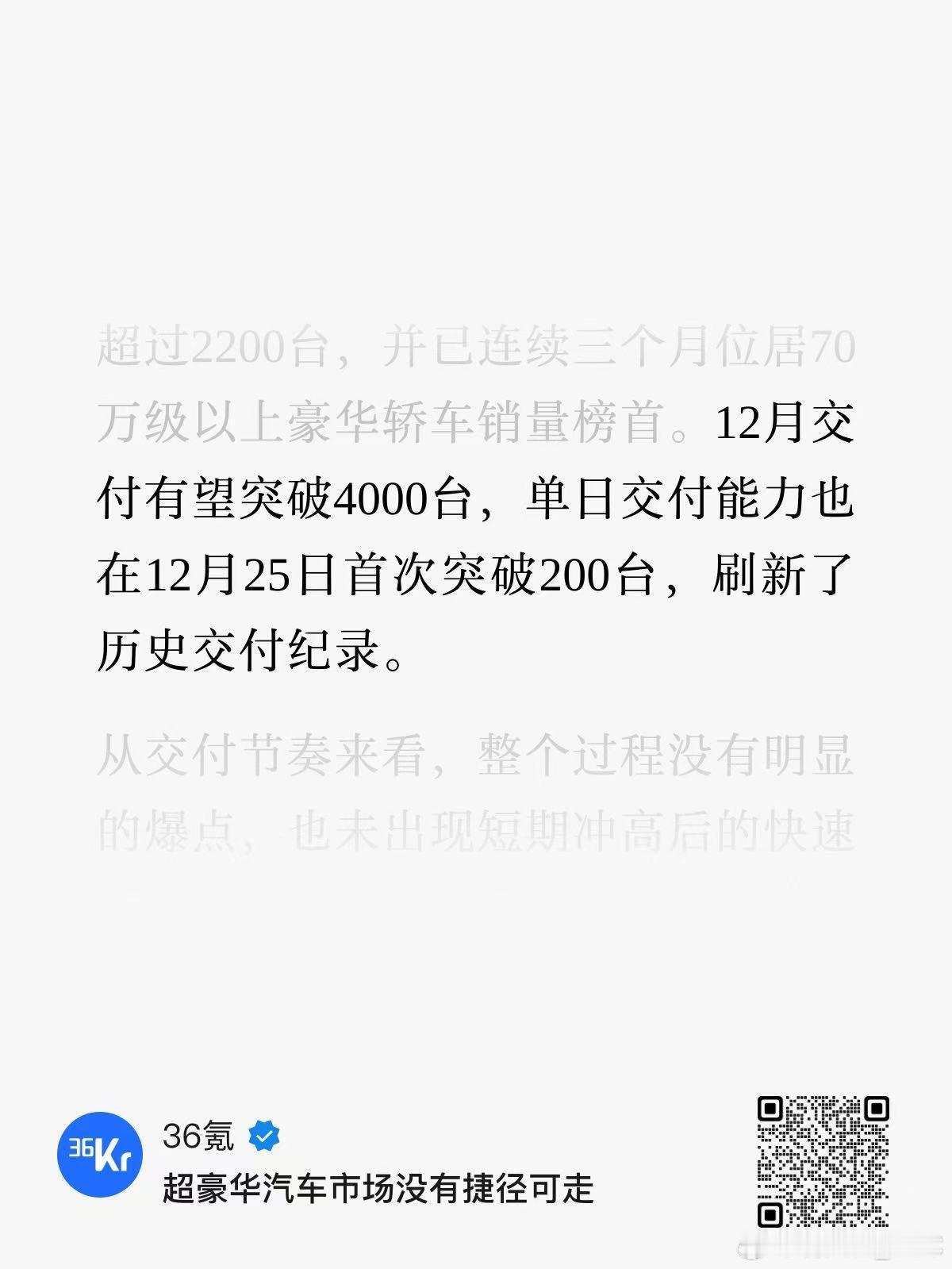 尊界 S800,12 月交付 4095 台,而且这还只是截至 30 日的数据。什么概念?比上个月 BBA + 保时捷,五款车加起来的销量还要多。更关键的是节奏。上个月刚破 2000,这个月接近翻倍;此前大家讨论的还是“交付卡在产能”,现在产能也已经拉起来了。在超豪华这个价格段,一旦规模和节奏跑顺,留给对手的空间,只会越来越小了。尊界S800