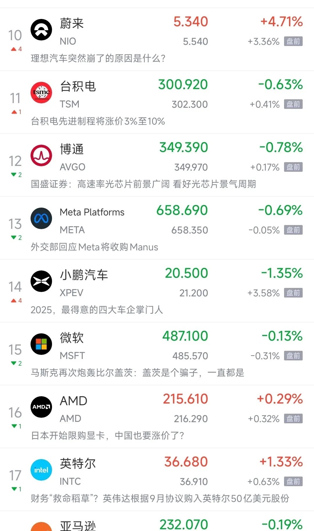 今天美股要反弹了,明天A股也要发红包了今晚美股科技股盘前开始反弹了,大型科技股基本上都翻红了,英伟达涨0.16%,特斯拉涨0.51%,AMD涨0.32%,英特尔涨0.63%。人工智能概念的科技股都在涨,也就预示着今天大概率科技股会有反弹。美股科技股的反弹会带动A股科技股的反弹。现在A股科技股才是市场活跃的主要板块,只有科技股涨才是散户真正赚钱的行情。而且明天A股是2025年最后一个交易日,应该会有一个不错的行情,作为2025年的收官之战。