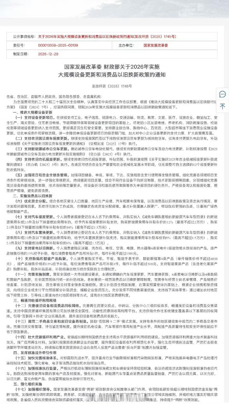 2026年国补方案来了。这次是按车价的比例算。-报废补贴:买新能源补贴车价的12%,上限2万;买2.0L及以下燃油车补贴车价8%,上限1.5万。- 置换补贴:买新能源补贴车价的8%,上限1.5万;买2.0L及以下燃油车补贴车价6%,上限1.3万。力度还是可以的,而且引导成交价往上走,别都补给紧凑级车和A0小车了。挺好的。汽场全开2026年国补方案