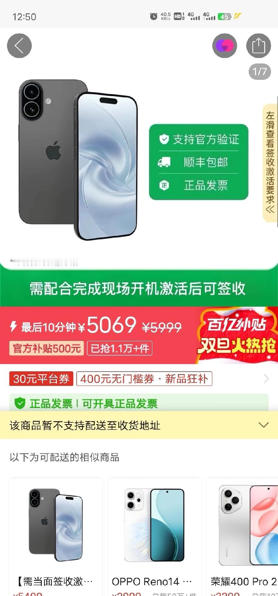 拼多多真行,好在不是花钱抢的券。 iphone17全是地址不配送,可惜这个400的券了。刷了一个钟都没买上,换手机计划流产。