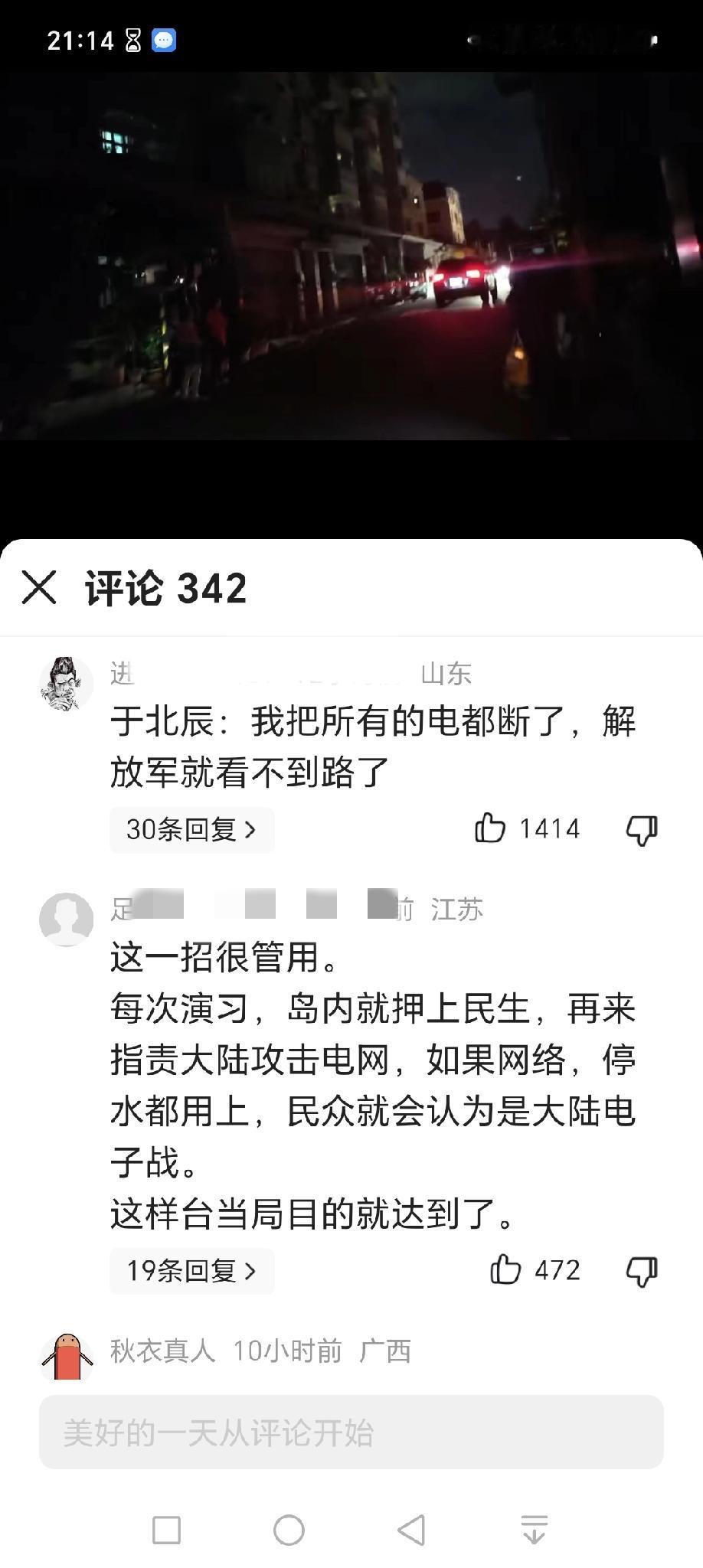 大陆刚军事演习,台湾就拉闸停电了! 网友一语中的! 网友一,于北辰:我把所有的电断了,解放军就看不到路了; 解放军:痴人说梦话! 网友二,这一招,很管用。每次演习,岛内就押上民生,再来指责大陆攻击电网。如果网络、停水都用上,民众就认为是大陆电子战。这样,台湾当局目的就达到了! 真是如意算盘,险恶用心,昭然若揭!