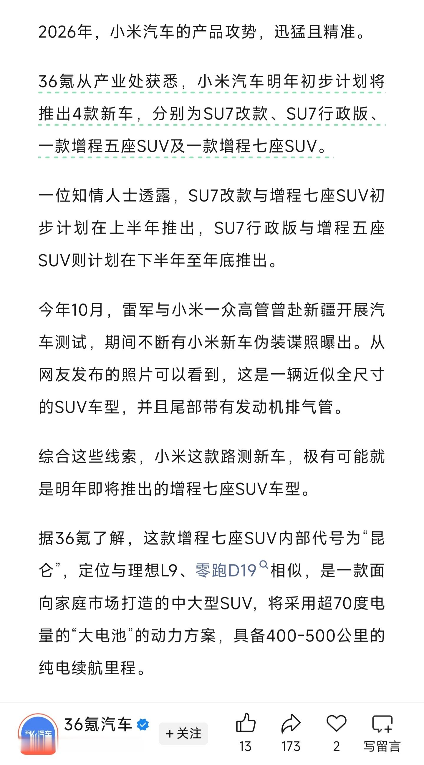 小米明年计划推出4款新车:SU7改款SU7行政版增程五座SUV增程七座SUV(36氪汽车消息)