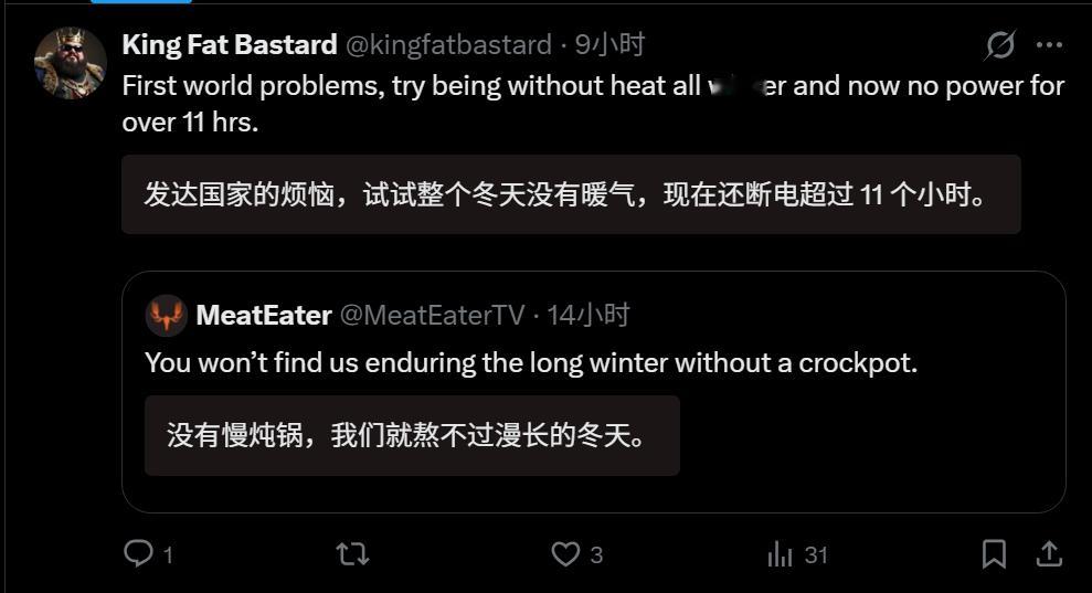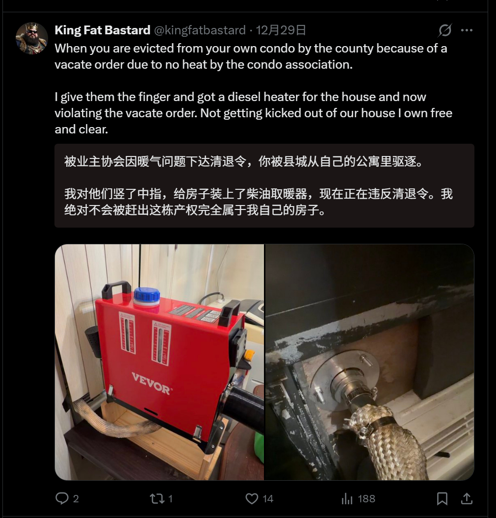 🔻网友分享:马里兰州那个“美国老爷们心善,见不得穷人住在没有暖气的屋子里”故事,还有新的后续。🔻这个卡车司机哥们儿不是说他违抗了当地美国县政府下达的撤离令,给自己安装了一台柴油暖气,然后搬回去了吗?🔻他准备跟当地对抗到底,“我对他们竖了中指,给房子装上了柴油取暖器,现在正在违反清退令。我绝对不会被赶出这栋产权完全属于我自己的房子。”🔻然后现在停电了。美网友承认美国斩杀线是事实热点现场海外新鲜事