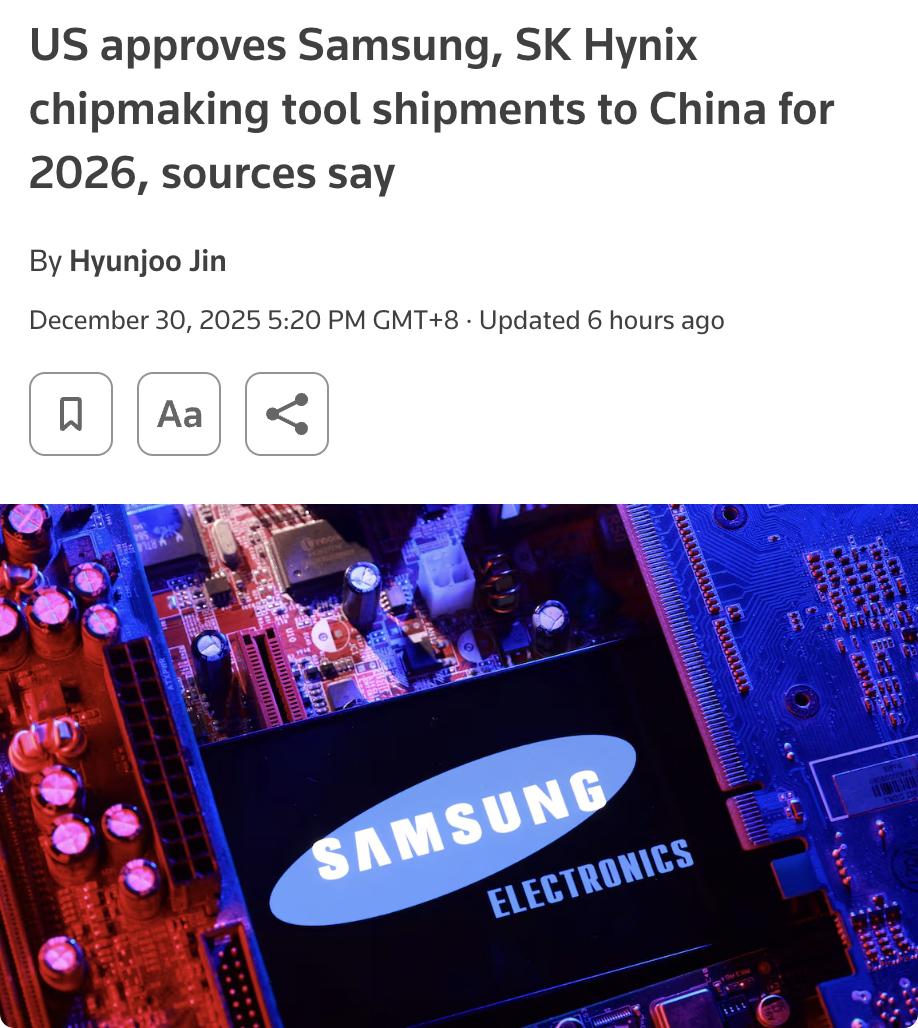 外媒:美国政府已授予三星电子和SK海力士2026年向其在中国的工厂运送芯片制造设备的年度许可。这一决定是在美国今年早些时候撤销部分科技公司豁免后,对韩国企业的临时缓解。 消息人士称,华盛顿引入了对华芯片制造工具出口的年度审批制度。三星和SK海力士是中国传统存储芯片的重要生产基地,由于人工智能数据中心需求增加和供应紧张,存储芯片价格正在上涨。