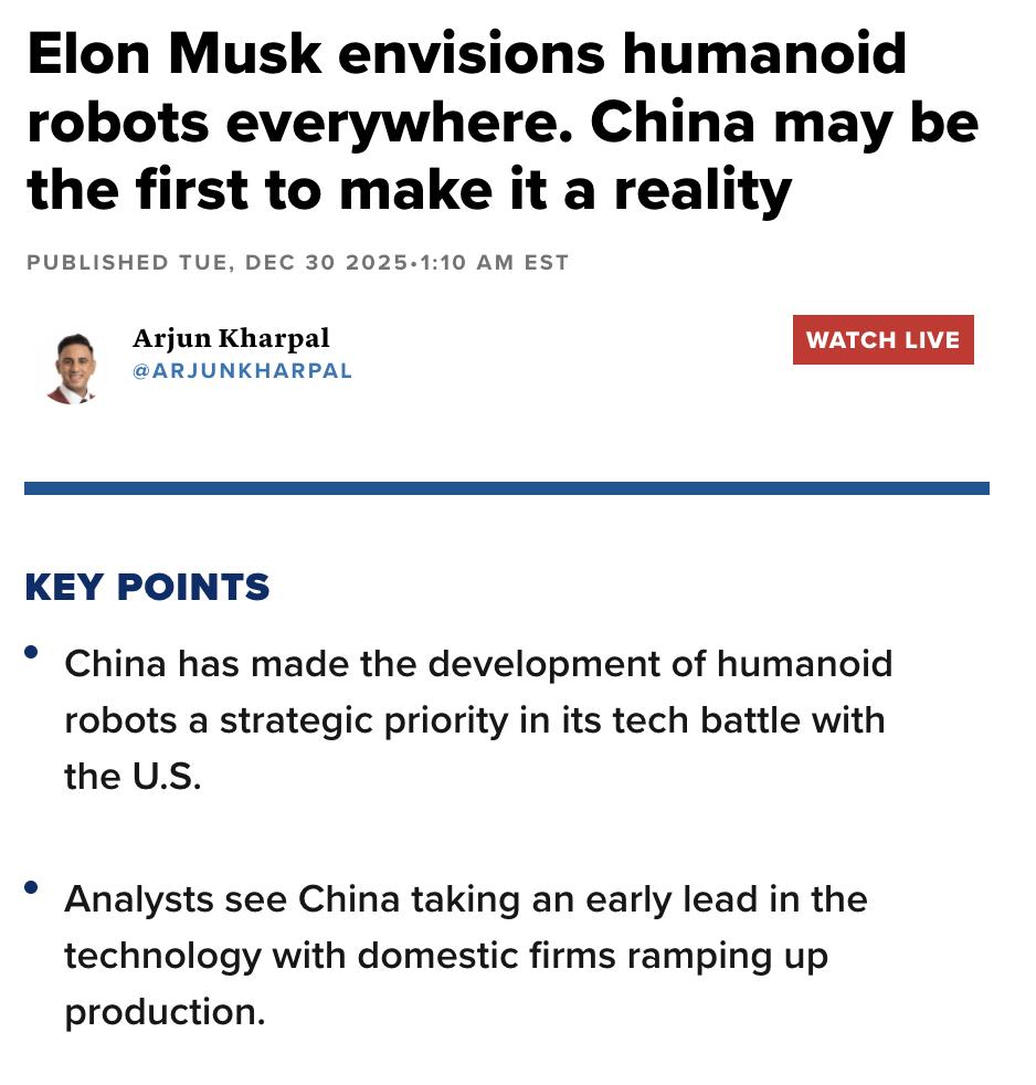 外媒:埃隆·马斯克设想机器人遍布世界,中国有望率先实现这一愿景 埃隆·马斯克今年将类人机器人推向聚光灯,认为它们是特斯拉估值的核心,可能达到万亿美元。然而,特斯拉的类人机器人“Optimus”尚未上市。与此相比,中国的多家企业预计将率先实现量产,并在2026年开始加速生产。 中国目前在类人机器人商业化方面领先美国,分析师认为,中国在这一领域的扩张速度较快。类人机器人作为人工智能驱动的硬件,具有类似人类的外形和动作,预计将应用于制造、服务业甚至家庭中。 中国将机器人技术列为战略重点,旨在解决人口老龄化及劳动成本上升问题,推动经济增长并提升全球竞争力。中国本土的机器人公司如优必选和宇树(Unitree)等,已经开始大规模生产,预计到2026年将推出数千台机器人。