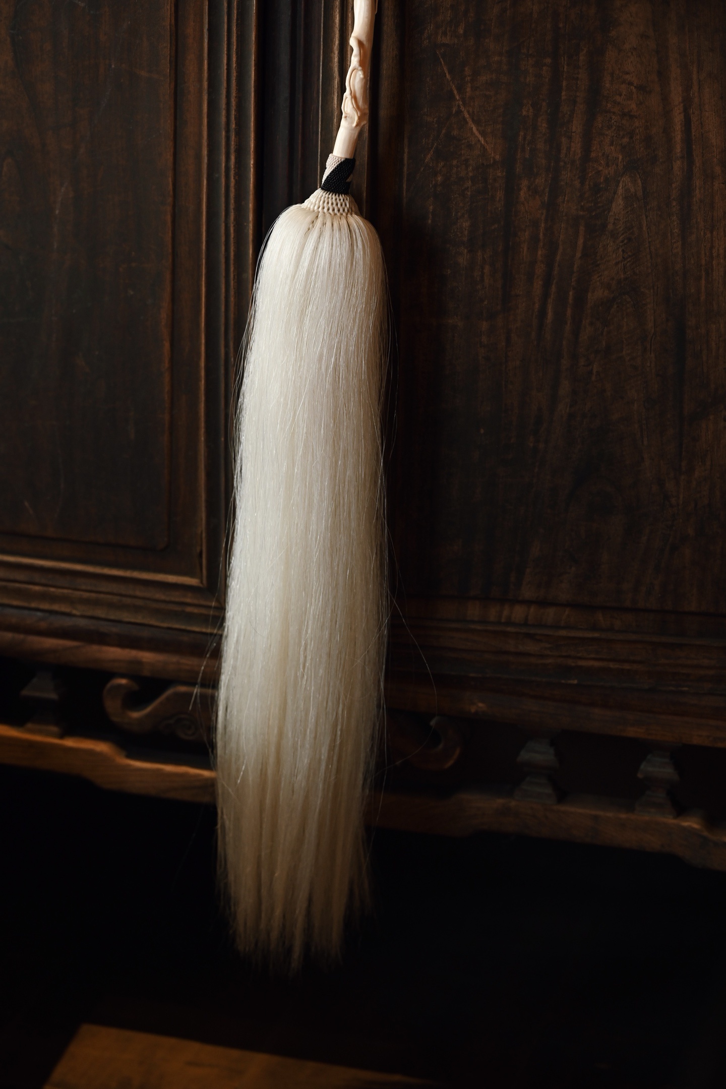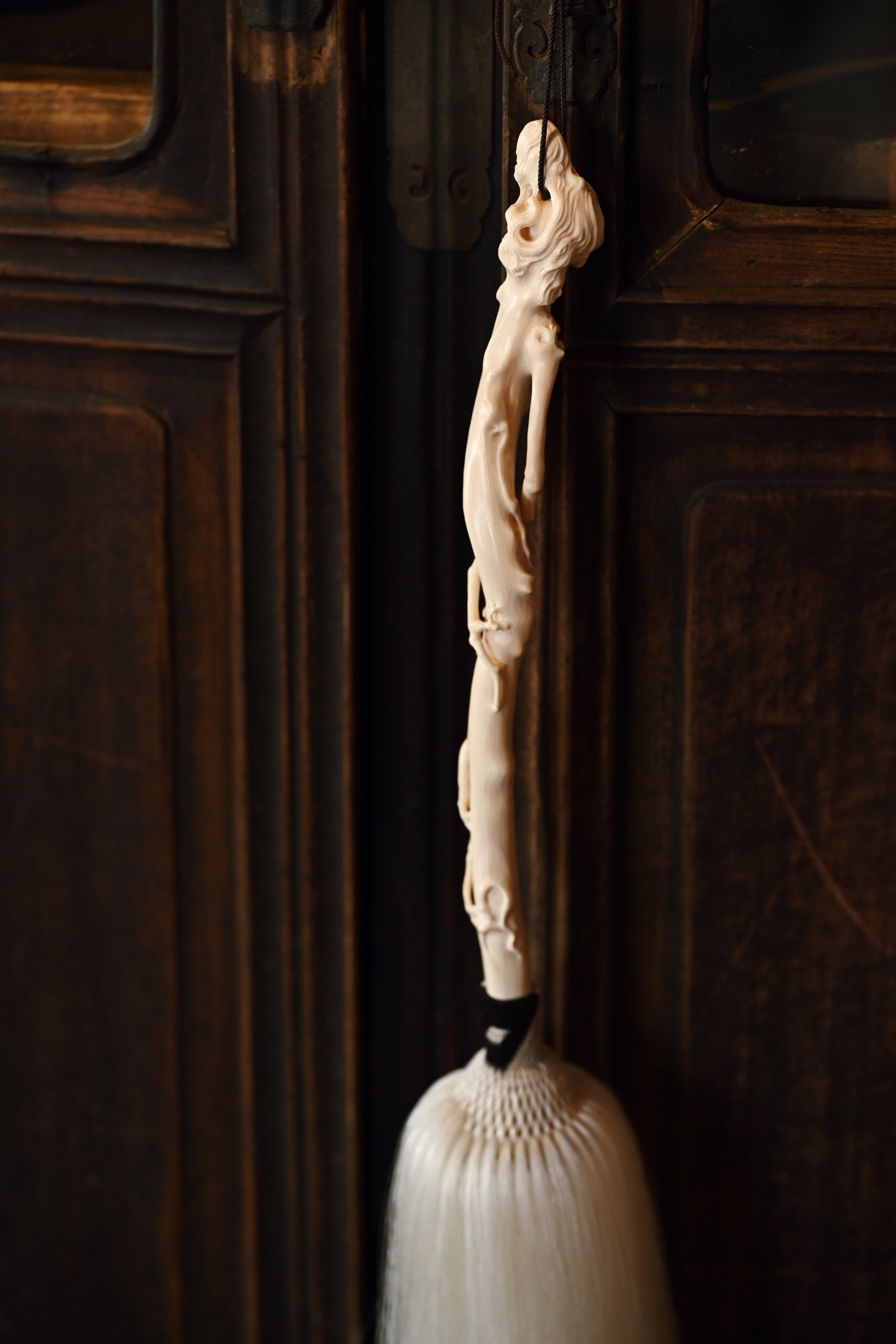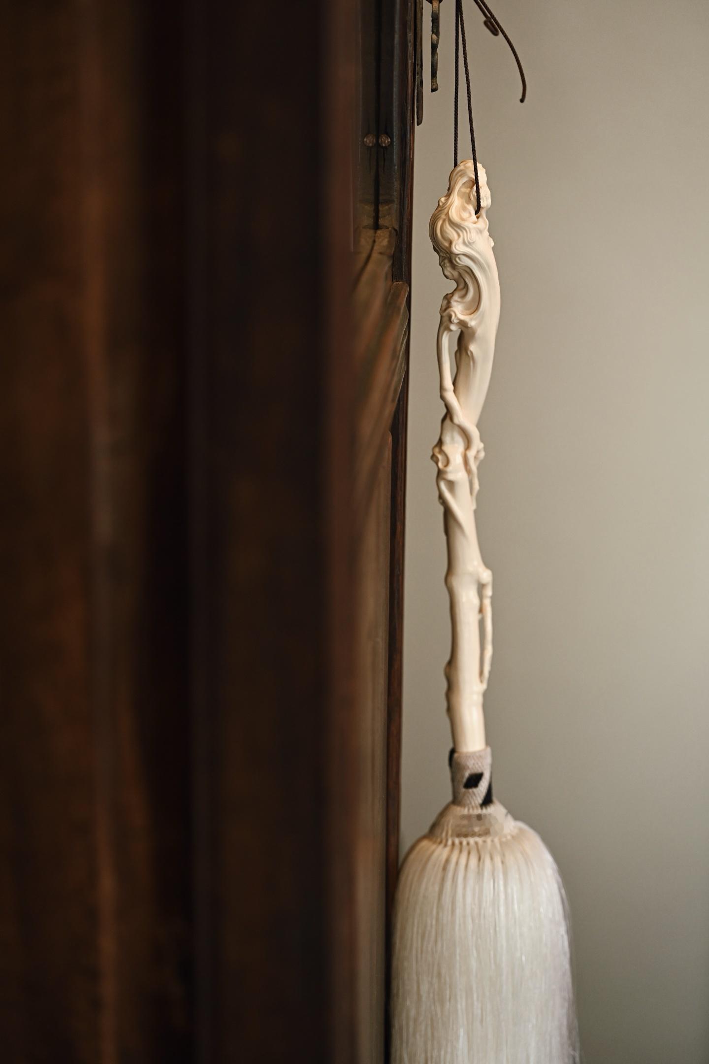 猛犸 | 清风处 拂尘 挂饰拂尘柄以猛犸雕琢而成,形如藤蔓缠绕,灵芝生发,拂尘头部马鬃尾自然垂落,气息灵动,形态自然拙朴,仙风道骨,为文人清供雅玩之难得佳器。拂尘29*3*3.2cm 155g 整体长87cm