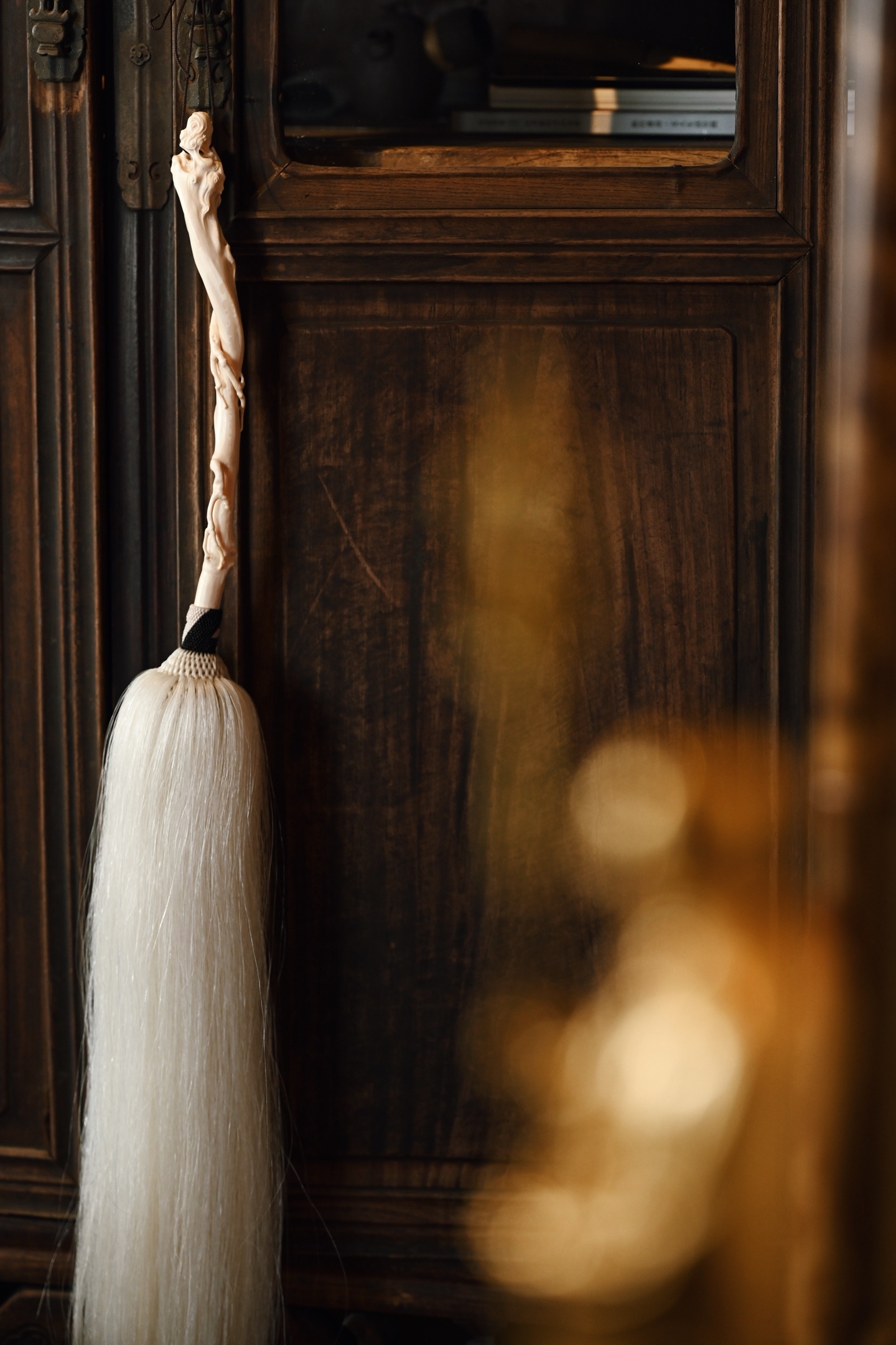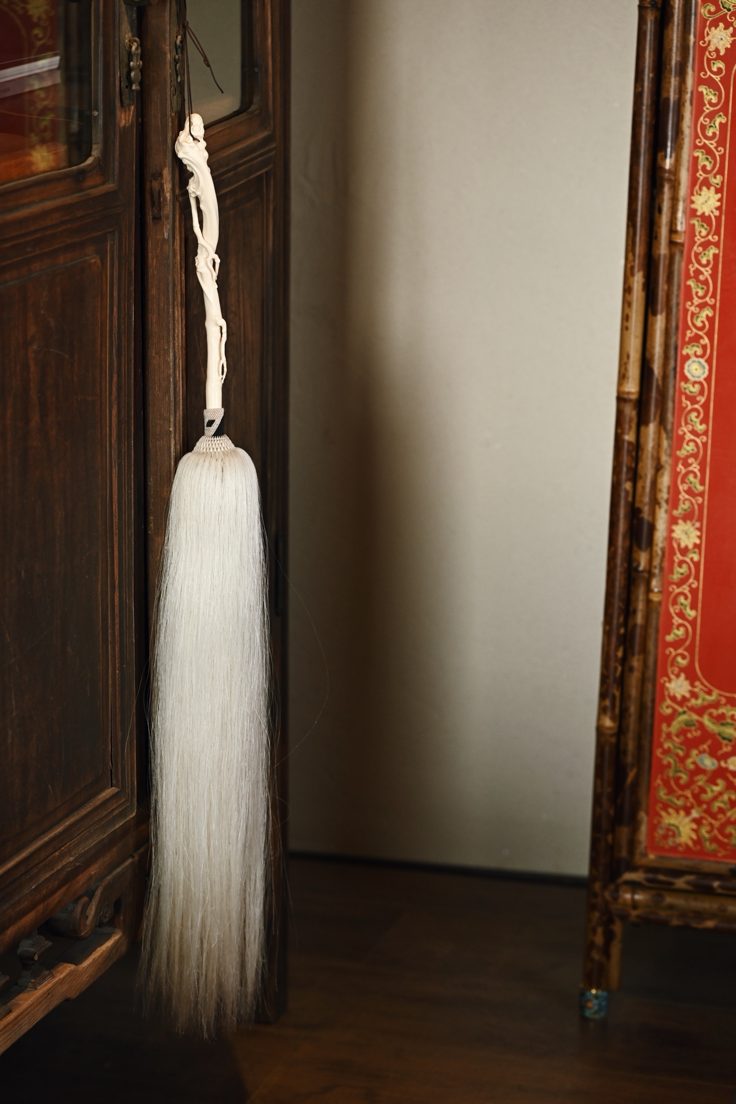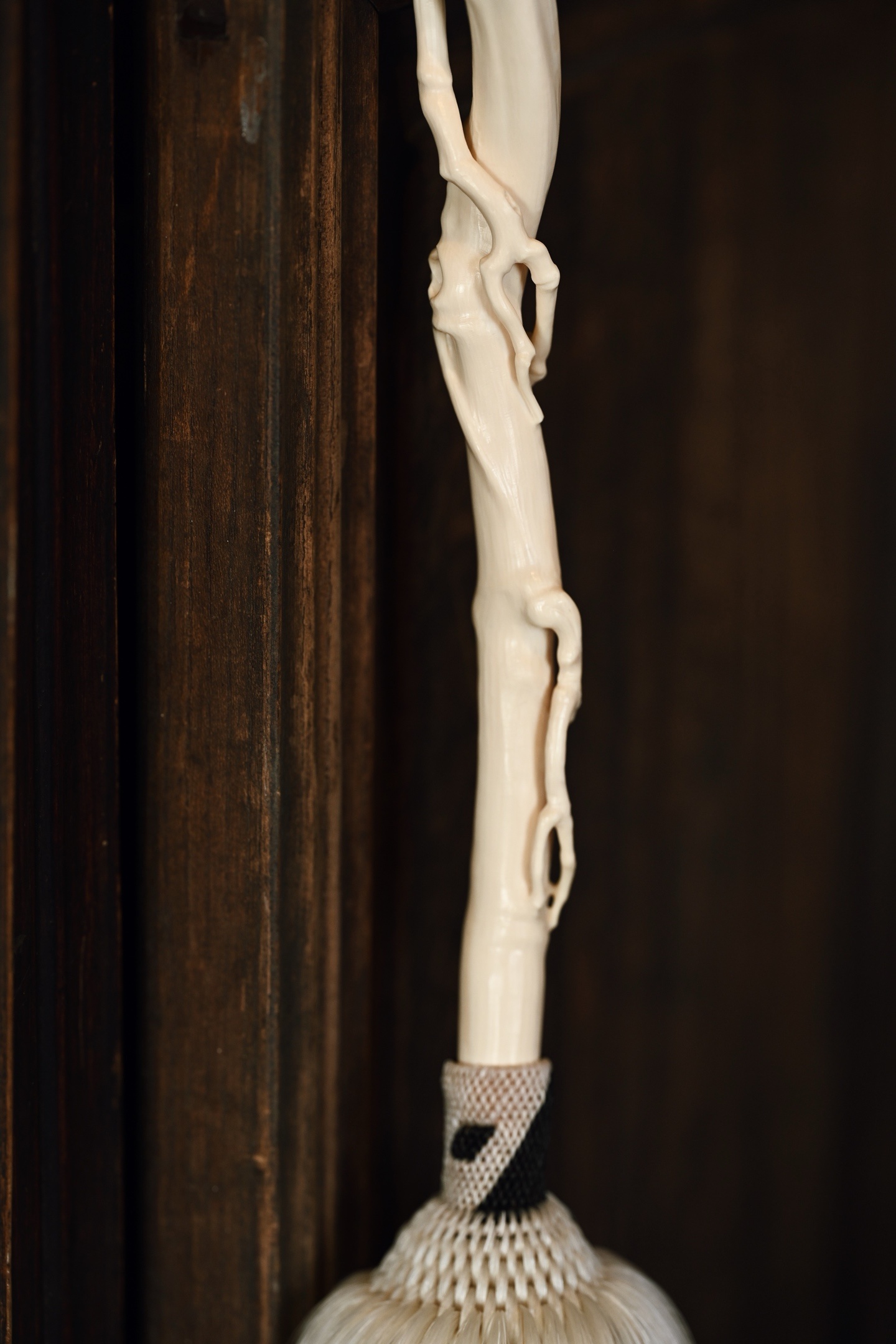 猛犸 | 清风处 拂尘 挂饰拂尘柄以猛犸雕琢而成,形如藤蔓缠绕,灵芝生发,拂尘头部马鬃尾自然垂落,气息灵动,形态自然拙朴,仙风道骨,为文人清供雅玩之难得佳器。拂尘29*3*3.2cm 155g 整体长87cm