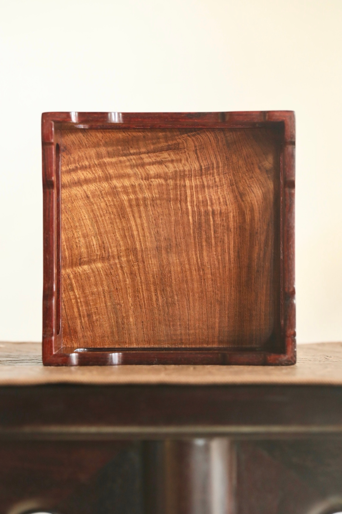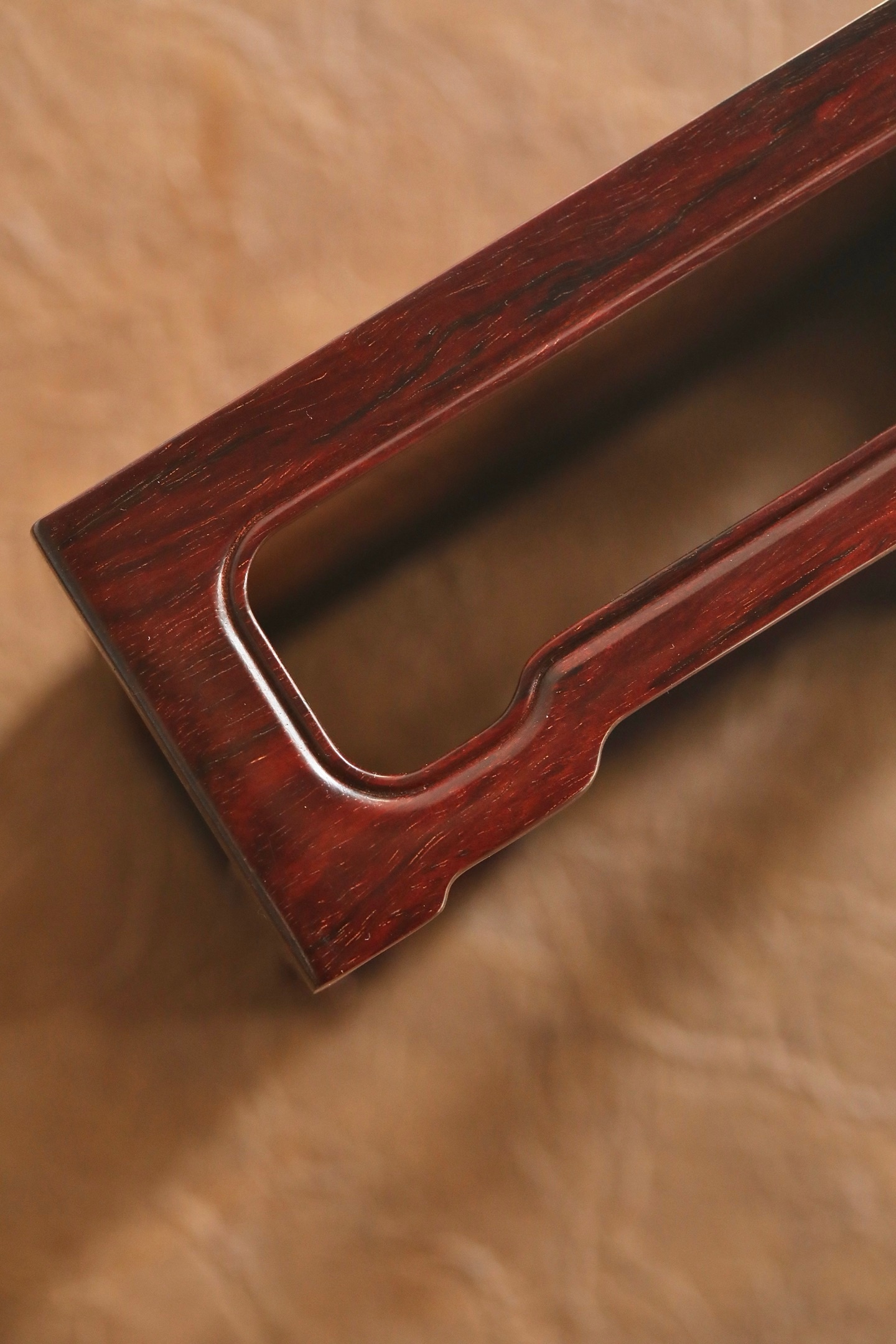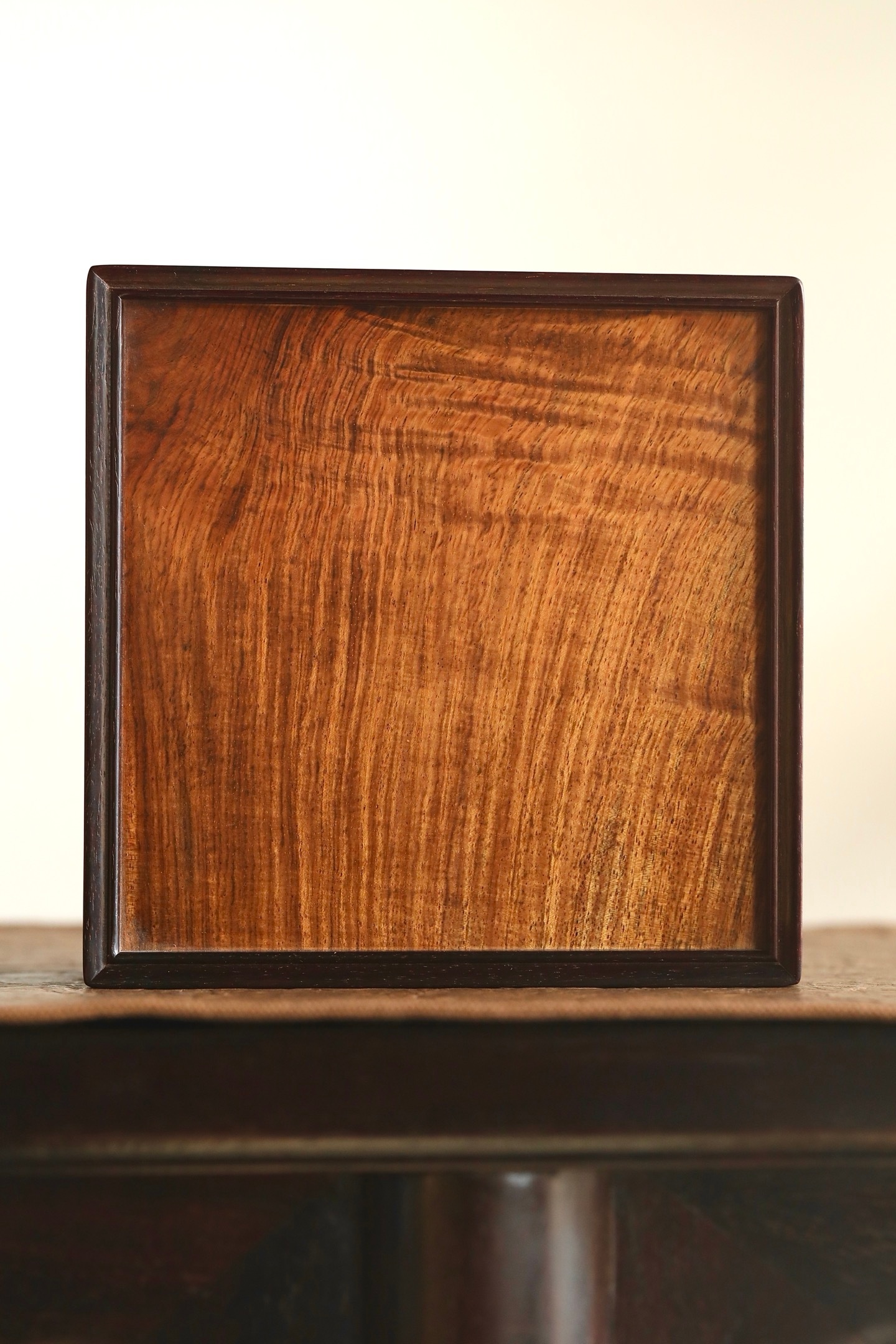 紫檀嵌花梨 | 底座 案几紫檀为框,花梨作面,整料拼接无隙,榫卯工艺稳固。紫檀色泽深沉如墨,花梨水波纹流云般舒展,一深一浅的木色碰撞,是工艺亦是美学。15.5×15.5×6.5cm