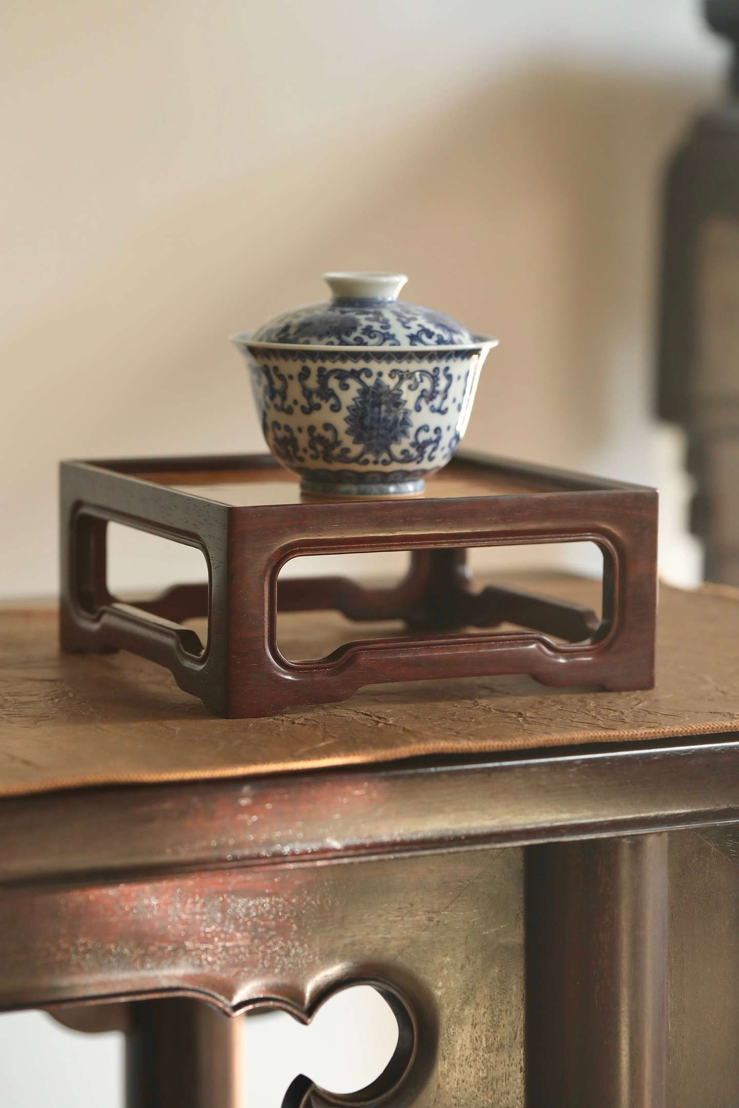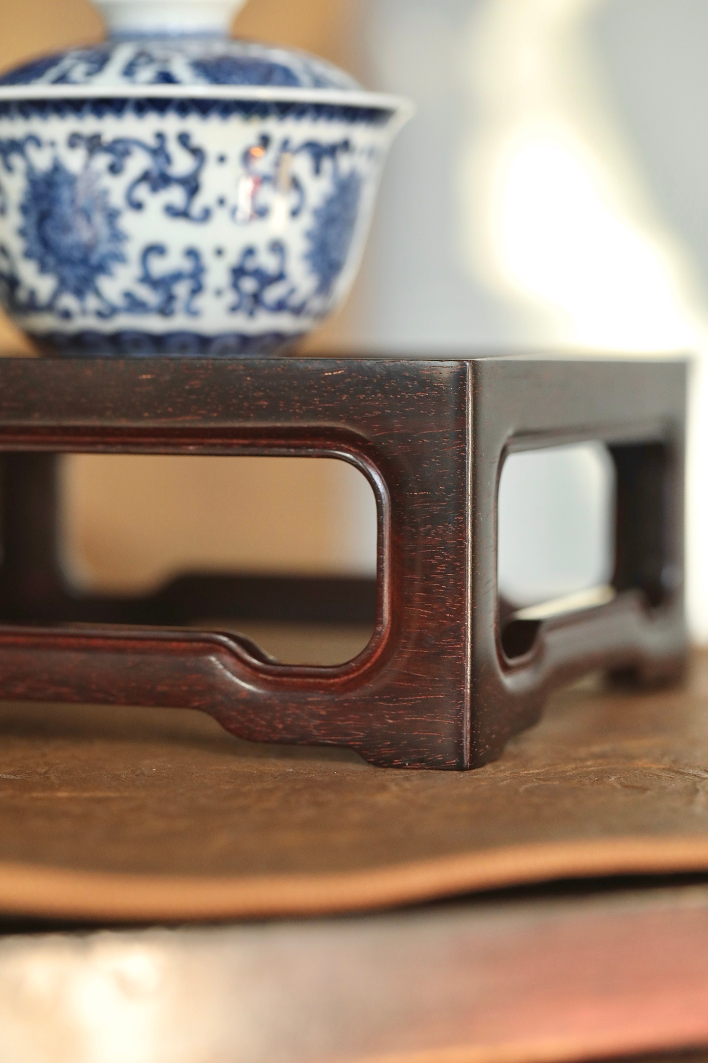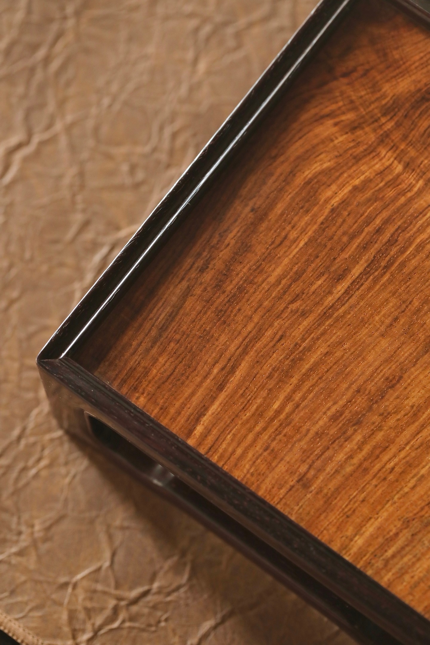 紫檀嵌花梨 | 底座 案几紫檀为框,花梨作面,整料拼接无隙,榫卯工艺稳固。紫檀色泽深沉如墨,花梨水波纹流云般舒展,一深一浅的木色碰撞,是工艺亦是美学。15.5×15.5×6.5cm