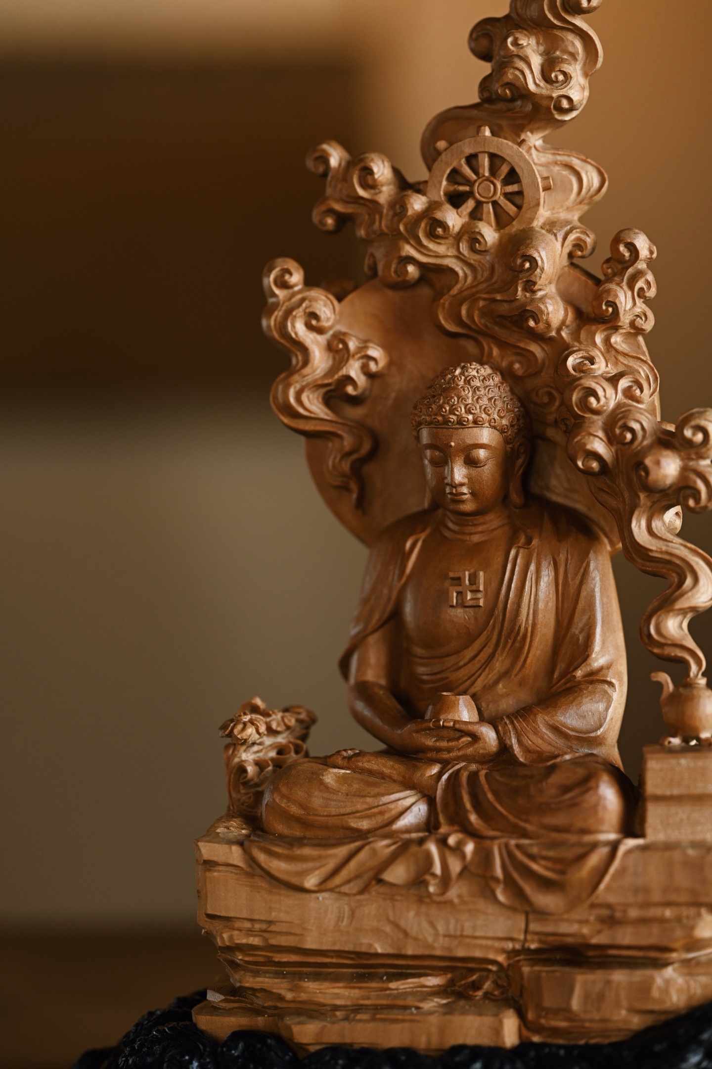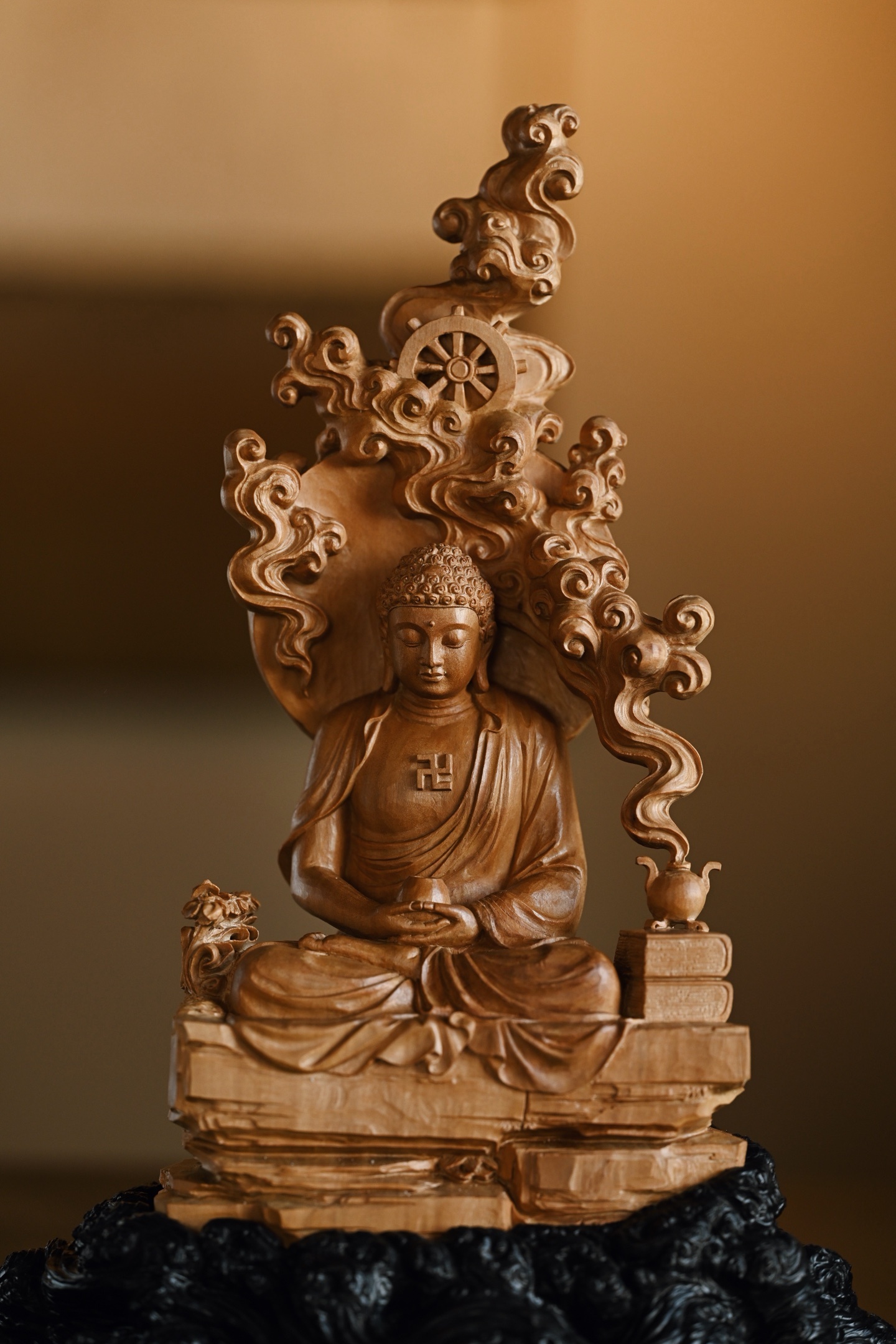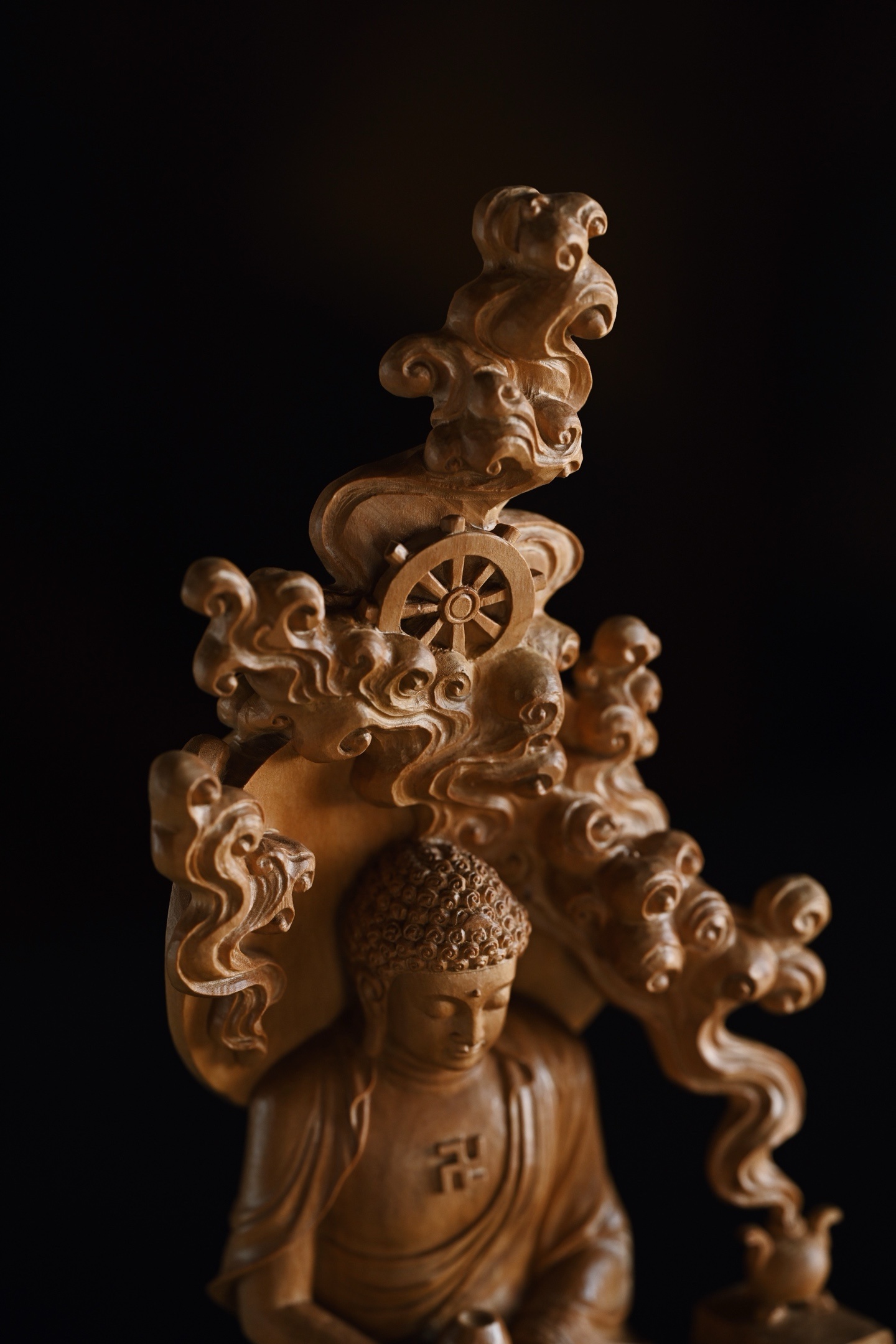 老山檀 | 释迦牟尼释迦牟尼跏趺而坐,面相雍容,双目微闭,静谧气敛,似在沉思,衣褶流畅相迭,神情静穆庄重,祥云升腾,尽显慈悲之气韵。20*12.5*27.5cm 1205g