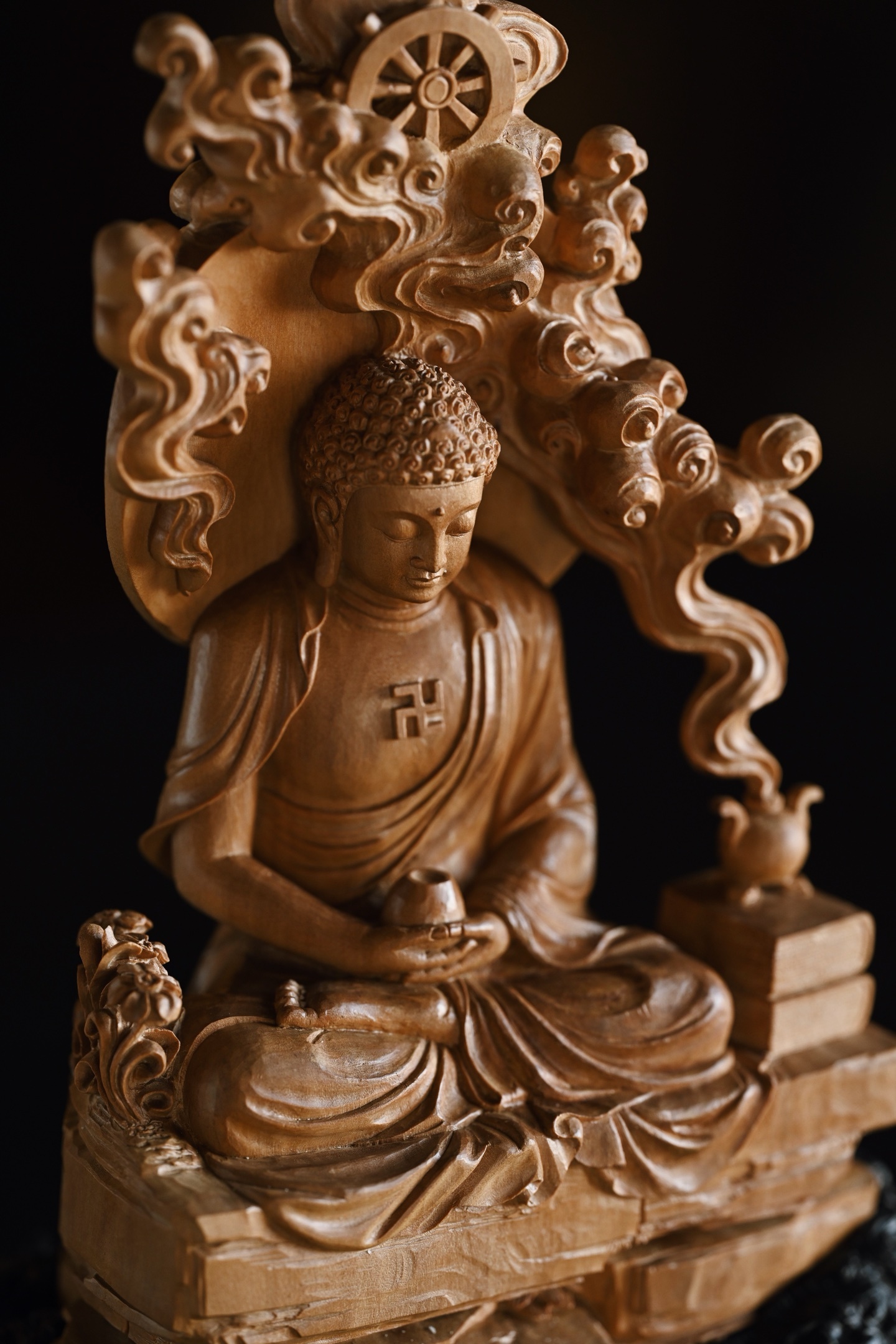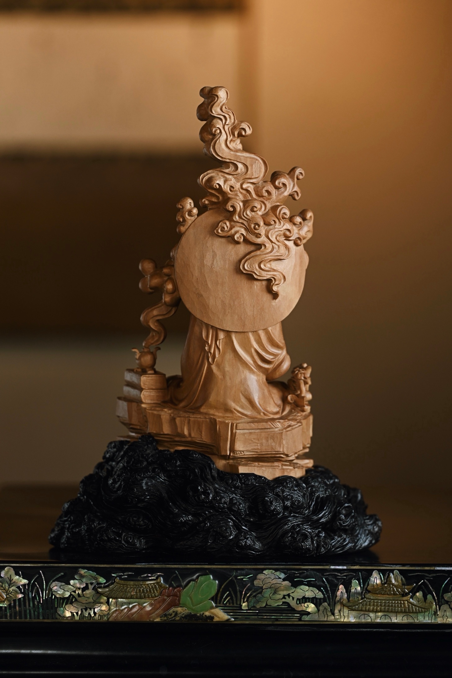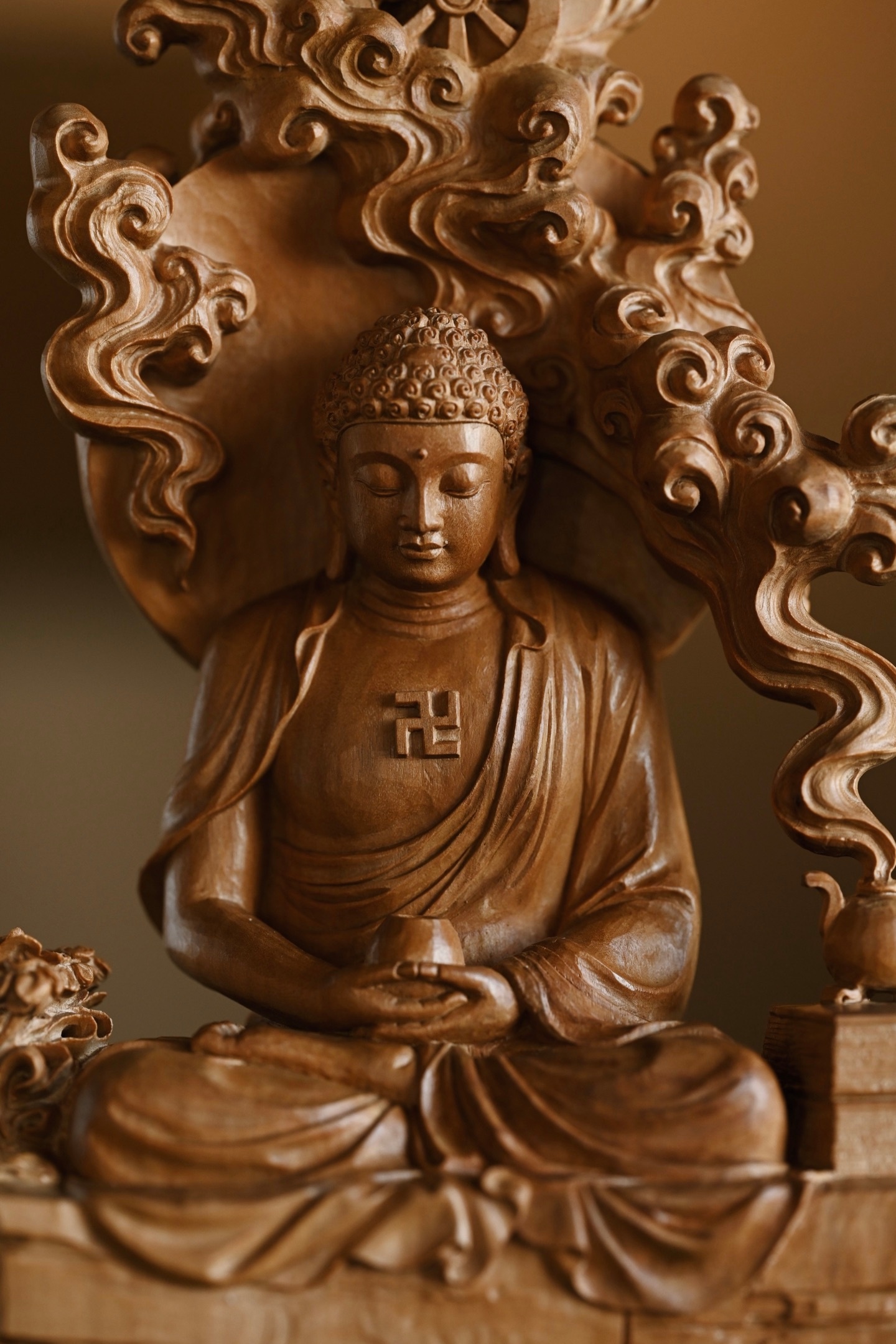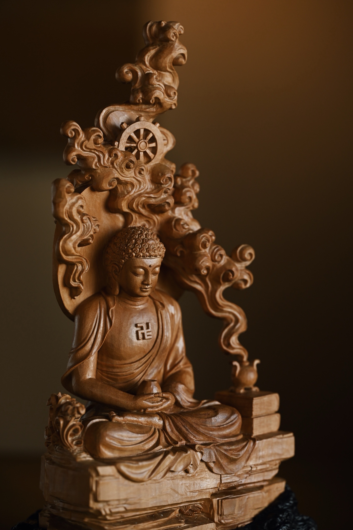 老山檀 | 释迦牟尼释迦牟尼跏趺而坐,面相雍容,双目微闭,静谧气敛,似在沉思,衣褶流畅相迭,神情静穆庄重,祥云升腾,尽显慈悲之气韵。20*12.5*27.5cm 1205g
