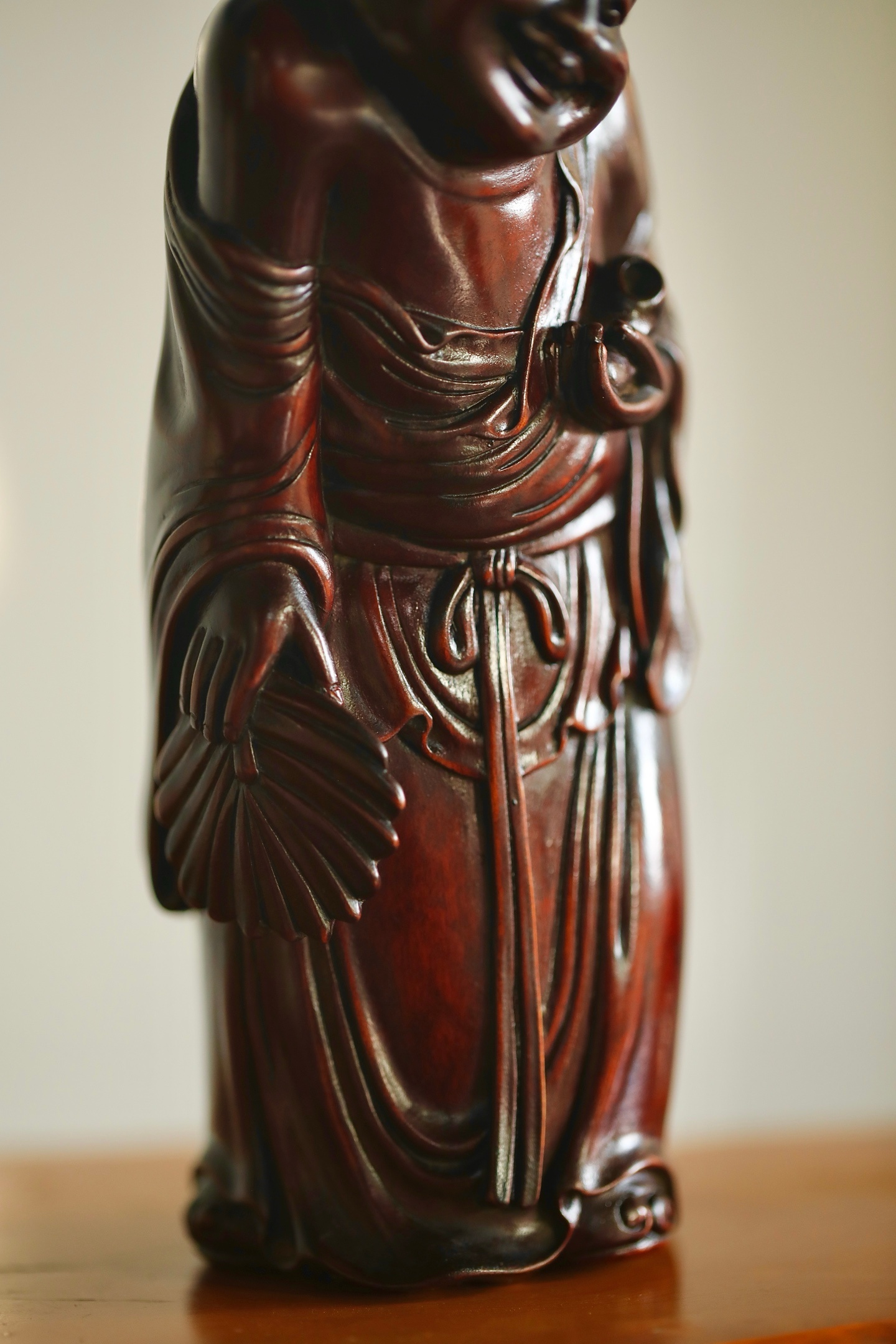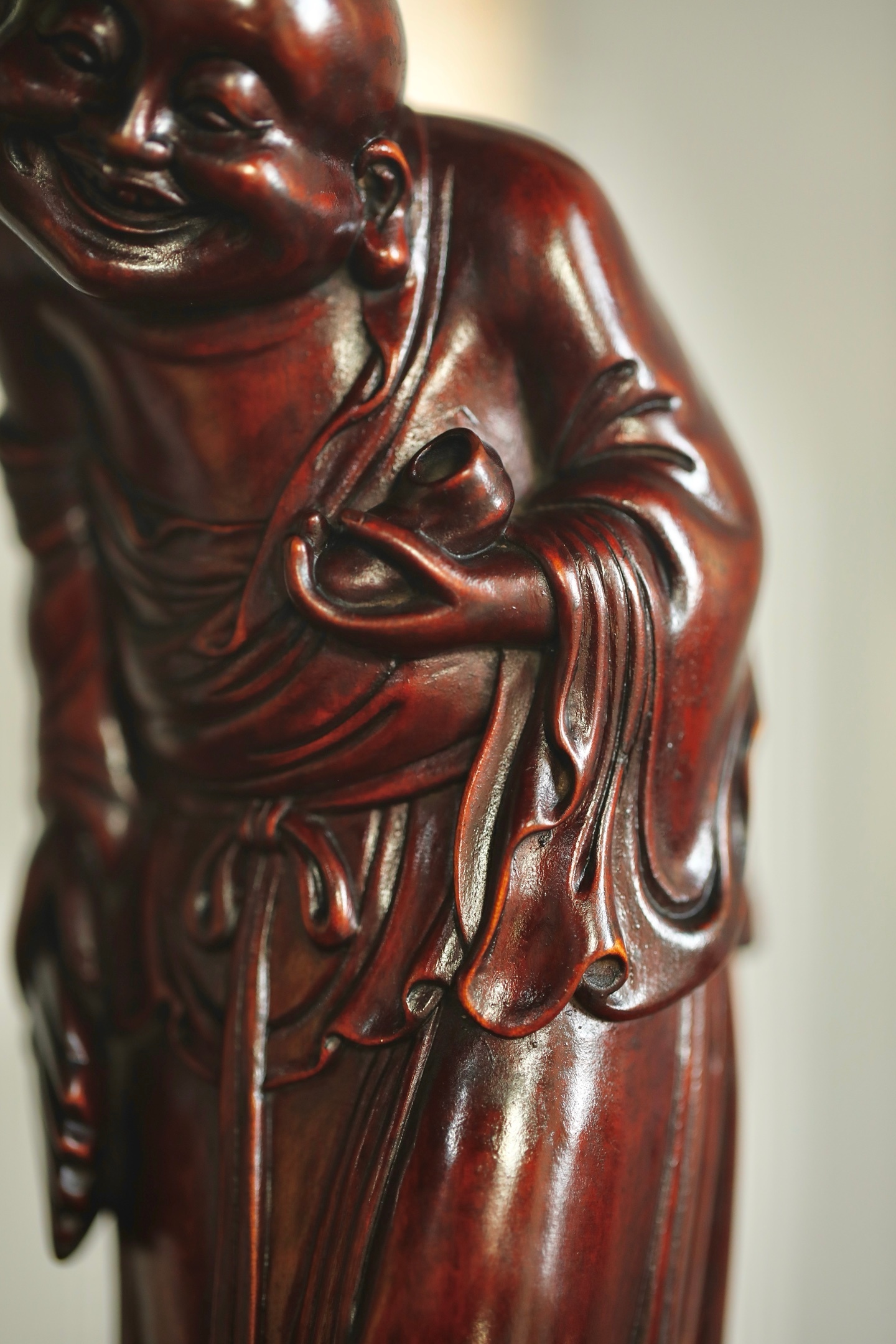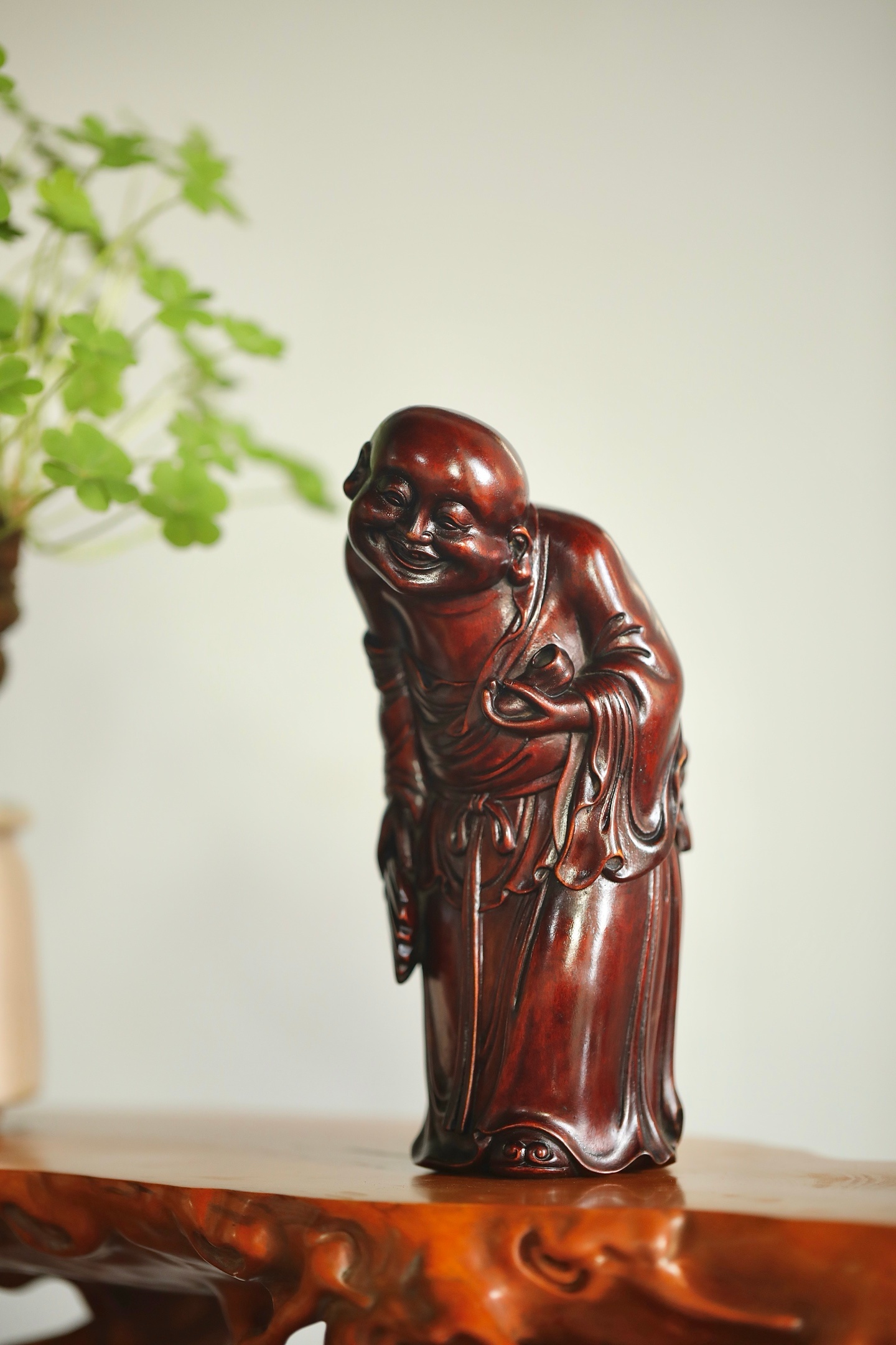 黄杨木 | 欢喜罗汉整料雕就的欢喜罗汉造像,眉眼弯弯藏着豁达,衣袂流转见刀工细腻,黄杨木的温润肌理衬着罗汉的喜乐神态,案头摆置,便揽一份满室欢洽的吉祥意。7.2×6.8×17.3