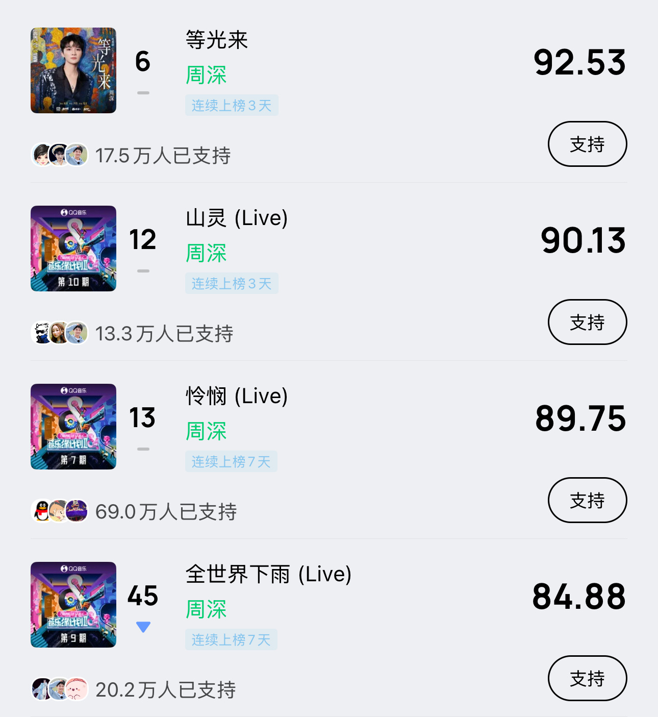 周深 📣 12.30 巅峰潮流 📣米米们晚上好,每歌做6个动作路径:Q音-乐馆-排行-潮流巅峰📍重点做新歌✅《等光来》✅《山灵(live)》📍其他top50✅《怜悯(live)》✅《全世界下雨(live)》完成『支持』让更多人听到深深