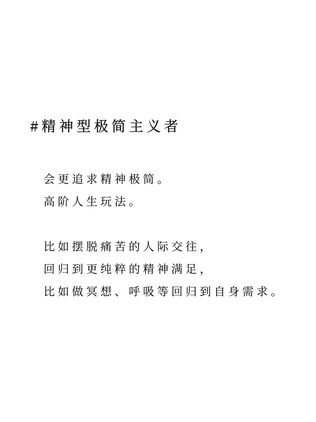 这类极简主义者会更追求精神极简,比如摆脱痛苦的人际交往,回归到更纯粹的精神满足,比如做冥想、呼吸等回归到自身需求。