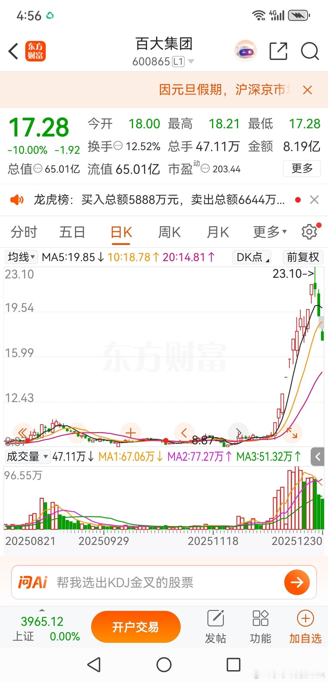 百大集团,涨的不咋地,跌起来却很凶。估计是A字杀,中途大概率有一次海底捞的欺骗式反弹,记住你千万别碰。财经股票