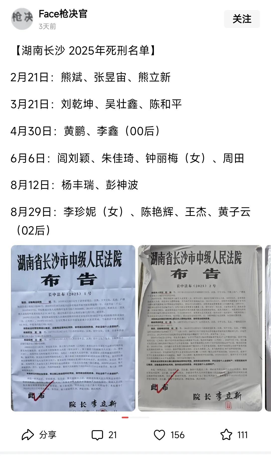 这位网友看来对这方面特别感兴趣,甚至连长沙市2025年一共处决多少死刑犯他都记录在案,而且这些人的姓名,性别,被处决的日期都记得清清楚楚,实在是个有心之人! 看他的网名也是很有特点,叫“Face枪决官” 。老实说,我看了他的这个名字,有点不寒而栗的感觉。 我没有看过他其他作品的内容,但是我猜测他在头条的创作是以这些内容为主。不得不说,他很有自己的想法,这就叫不走寻常路,独辟蹊径,估计他在头条的收入应该不错吧。