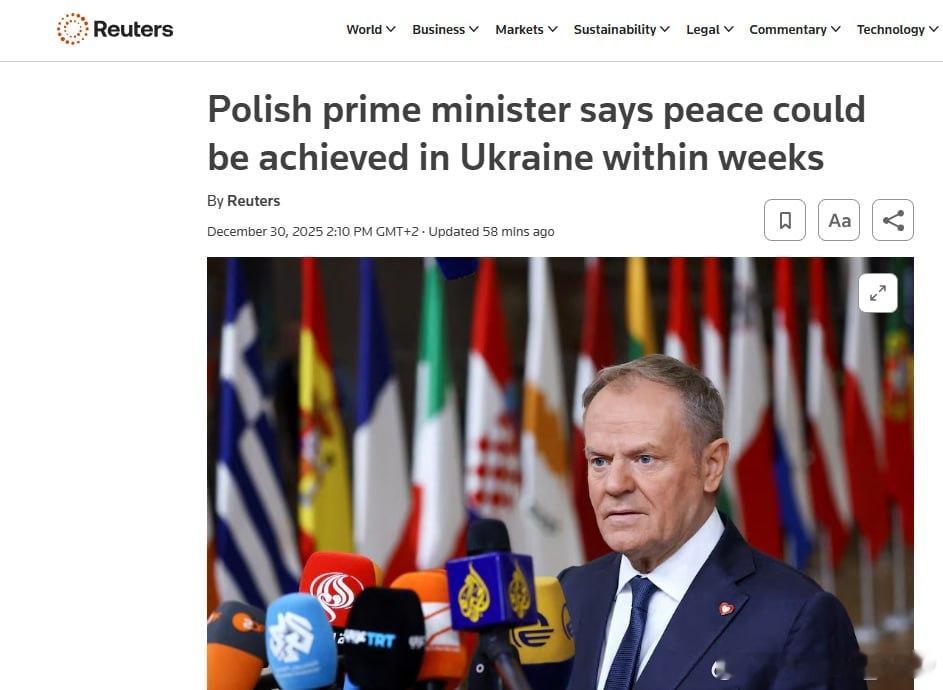 波兰总理图斯克表示,乌克兰和平有望在数周内实现,但乌克兰必须在领土问题上做出妥协