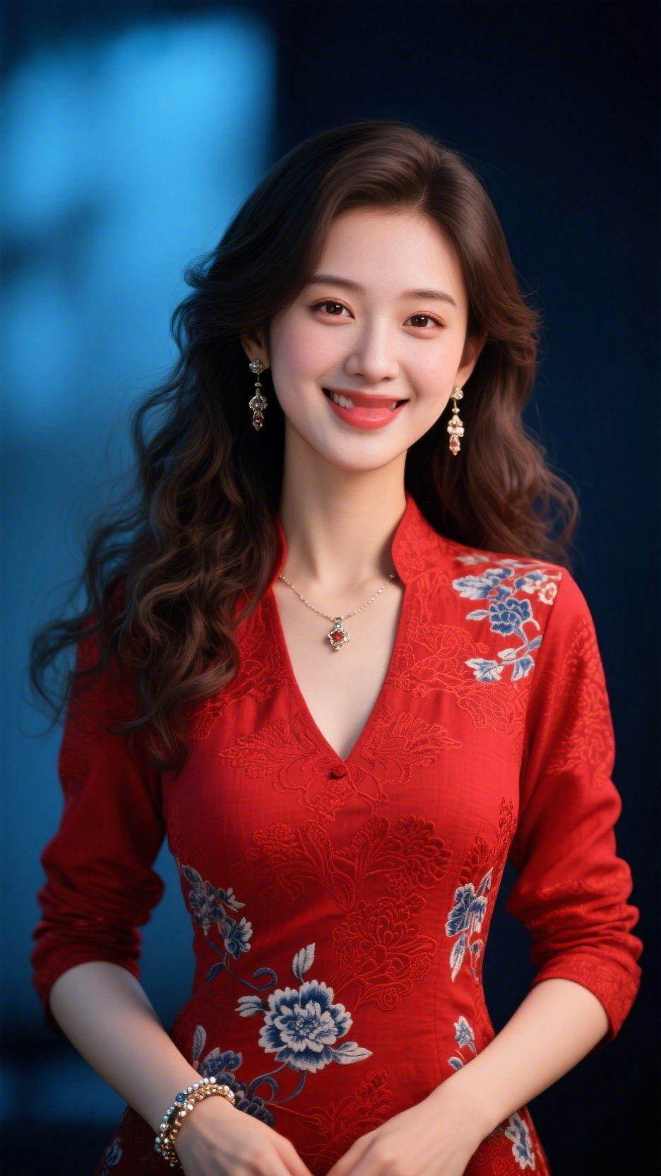 《红旗袍伴光的明艳》 幽蓝背景里的柔光轻落红旗袍之上——绣花纹路缀于衣料间,领口妥帖裹着舒展气息,耳饰与颈链的光泽柔融在衣色里,连发丝蜷曲的弧度都浸着温软。 她立在光影中,笑意落进眼底,周遭静意成了衬景,只剩衣装的雅与柔光的润悄然相融。这哪里是寻常穿搭?分明是把中式的明艳,织进衣袂的每一处舒展里,明媚又妥帖。 红旗袍的明艳韵致 衣装的柔润质感