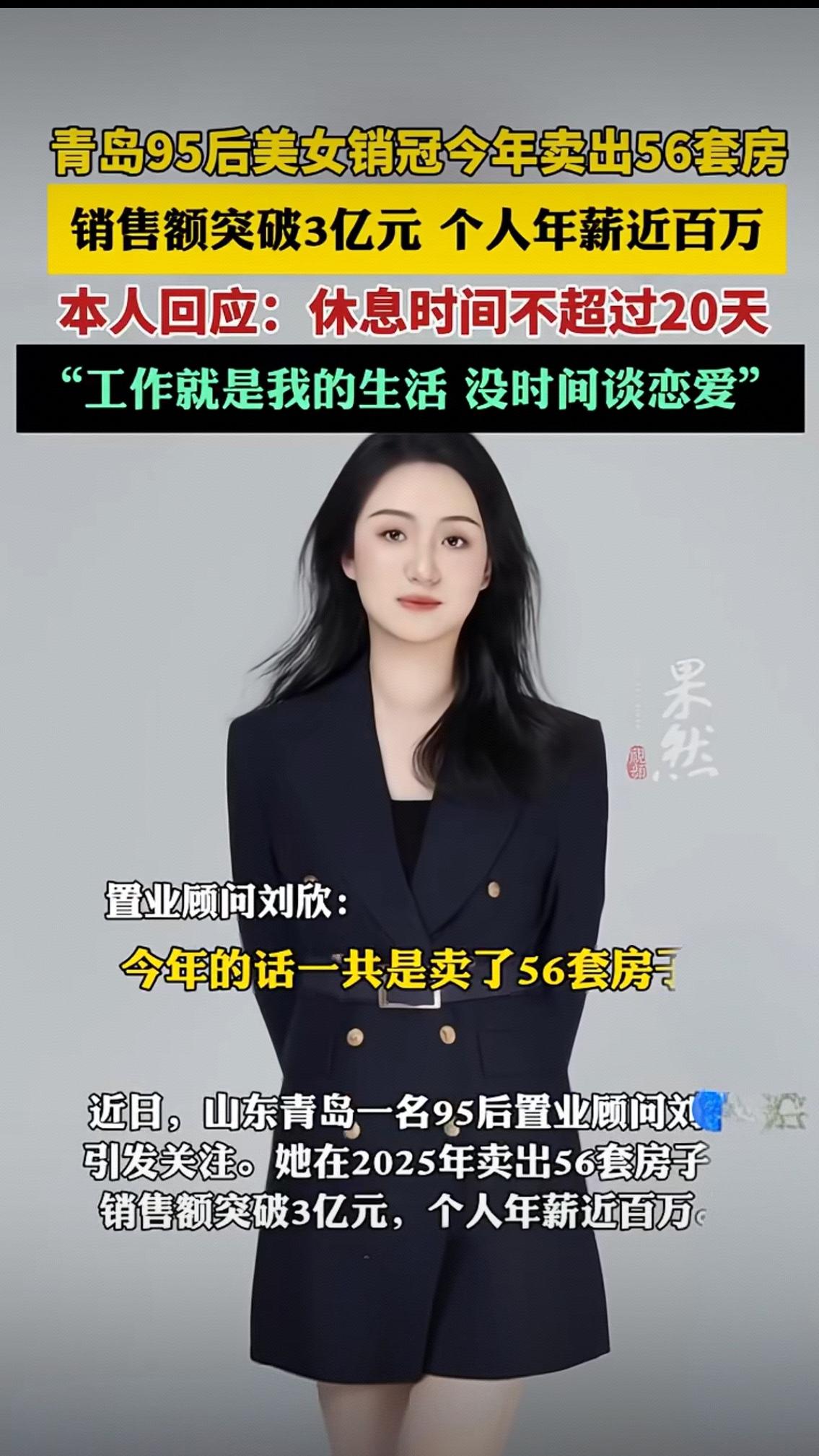 青岛95后销冠3亿业绩背后:一年休息20天,爱情让位于生活的清醒抉择 当“青岛95后美女销冠年售56套房”的话题刷屏时,3亿销售额、近百万年薪的数字让无数人惊叹,可那句“休息时间不超过20天,没时间谈恋爱”的回应,才真正戳中了当代年轻人的生存共鸣。在2025年青岛楼市冷热反复、多数楼盘月销个位数的寒冬里,这位叫刘欣的姑娘,硬生生用极致付出走出了一条逆势之路。 谁能想到,如今的“卖房神话”也曾差点打包行李回老家。刚入行前3个月,她一单未开,被客户怼“不专业”后躲在楼梯间痛哭,底薪只有4000块的日子里,连房租都要精打细算。但她没选择躺平,而是把客户的每一个疑问都变成学习的机会,把别人摸鱼的时间用来研究区域规划、计算得房率,终于摸透了“黄金40分钟决策期”的秘诀——5分钟摸清核心需求,15分钟算透置业成本,剩下的时间全用来帮客户规划未来的家。 这份成绩从不是靠“颜值红利”,而是藏在无数个细节里:微信满5000人上限,要删旧同事才能加新客户;朋友圈从无硬广,全是客户交房笑脸和学校实拍;发烧39度挂水时,还在视频里给客户讲阳台改造方案;300多户家庭的档案里,记着孩子上学半径、老人就医动线的琐碎需求。当质疑者暗讽“靠资源”时,她用60%的老客转介绍率证明:把客户的事当自己的事,才是最硬的底气。 “工作就是我的生活”这句话,听着霸气实则满是取舍。当同龄人在豆瓣小组分享“下班去班味儿”的快乐时,她的休闲时间是陪客户看房、深夜解答疑问;当别人忙着组CP、约夜校时,她的社交圈全是业主和房源。有人惋惜她错过爱情,可她心里比谁都清楚:百万年薪从不是天上掉的馅饼,而是每单1.5万-2万提成攒出来的底气,是在行业“剩者为王”的法则里,用坚持换來的选择权。 网络上的声音从未停歇:有人羡慕她的高薪,有人心疼她的忙碌,也有人争论“要不要为事业牺牲生活”。但刘欣的故事本质上无关对错,只是当代年轻人的一种清醒抉择——在想要的生活面前,谁不是一边放弃一边坚持?那些看似光鲜的成绩背后,从来都是“别人看不见的地方加倍努力”。 有人说她太拼,可成年人的世界哪有容易二字?你羡慕她的年薪百万,就得接受她全年无休的付出;你向往安稳的生活,就要接纳平凡的收入。这个95后姑娘用行动告诉我们:所有逆天改命的背后,都是咬牙坚持的日常。那么你觉得,这样的付出值得吗?