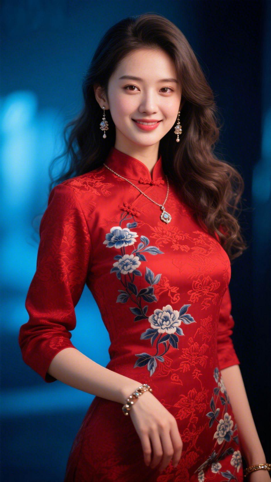 《红绸裹春,雅韵藏眸》 一袭正红旗袍,是时光凝就的朱砂色,淌在缎面的柔光里。斜襟盘扣轻系着东方意趣,蓝白绣线晕开的牡丹,如晨雾里栖落的云,在肩臂间舒展着瓣纹。 她抬眸时,笑意漫过眉梢,像檐角轻垂的月,让周遭的蓝调都柔和了几分。耳坠摇着细碎的光,颈间坠子漾开星点莹润,腕间珠串碰出的轻响,是心事落在时光里的轻音。 这红不是灼目的艳,是浸了江南烟水的柔,裹着舒展的妥帖,把东方女子的温婉,织进每一寸衣料的纹理里——美从不是张扬的盛,是藏在眉目与衣袂间,恰好的雅静。 旗袍雅韵 东方温婉