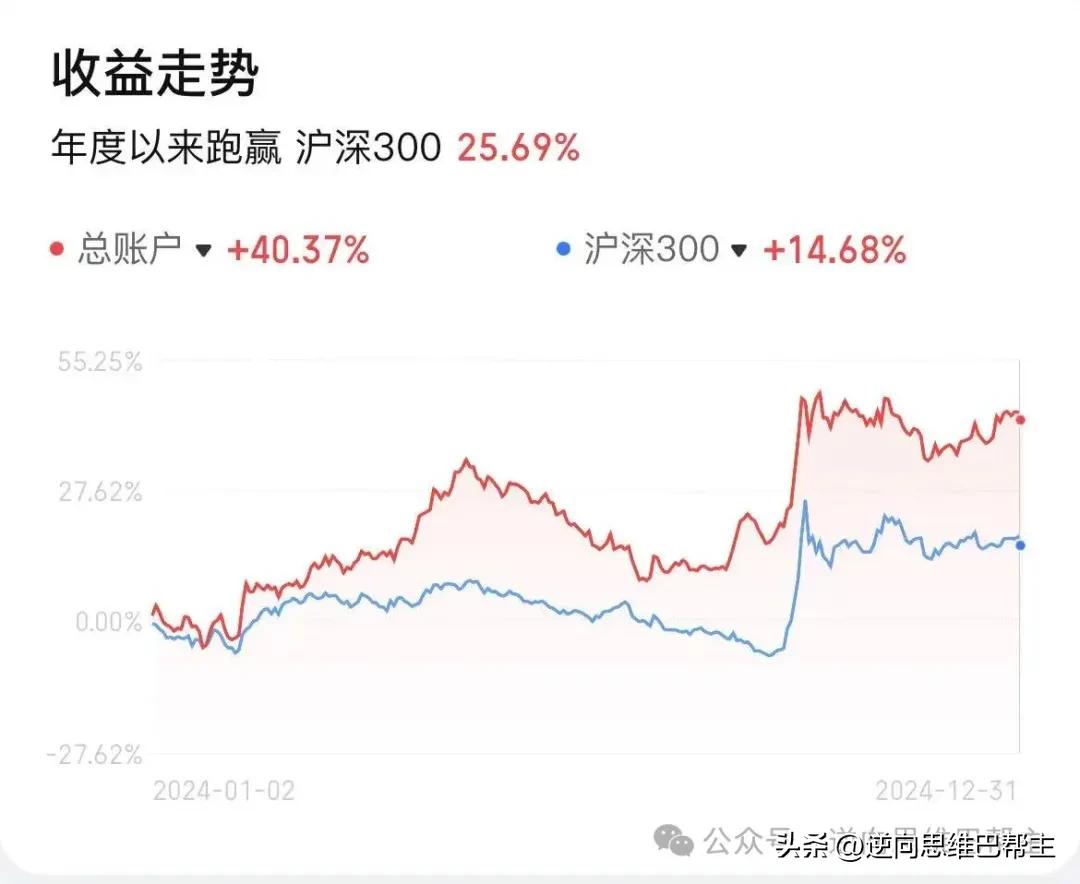 2025年最后一个交易日了! 做一个简单总结: 截至今日上午收盘,收益率47.58%,成功跑赢沪深300、跑赢29.15%,在没有杠杆的情形下,能取得这个收益率,巴帮主还是挺满意的! 去年2024年收益率40.37%。 2025年的收益率在2024年的基础上有所上升! 新的一年即将开始,希望2026年巴帮主能有新的斩获! 也祝愿我的粉丝投资者朋友们在新的一年能取得满意的收益!