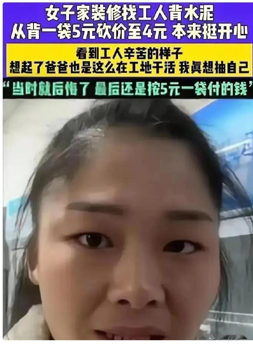 河南一女子装修雇老人扛水泥,把5块一袋压到4块,看老人满头汗爬五楼扛完30袋,她当场掏200块塞过去,说“叔,对不起,我占便宜了”视频里老人手都是抖的,还点头说谢谢,网友刷到直接破防。 视频中的画面更是让人心里暖暖的。虽然这200块钱不是多么大的数目,但是她却把原本应该给老人的差价补上了。 有人说这不是慈善,这不过是捡回人情吧,良心吧,还有好人的标准吧。这也难怪,现在的人太缺乏人情味了,太缺乏良心了,人家扛一袋水泥上五楼,你说这点钱都不值的给补上吗? 可是偏偏这样的小事,现在很多人做不到,都觉得自己给别人赚钱了,就好像给别人白干活一样,其实不管做什么,别人都是有成本的,都是辛苦的, 这才是做人应该有的基本原则吧,不管你是做生意也好,做官也好,做慈善也好,捡回的应该是人情吧, 不应该丢掉的应该是良心吧,不应该忽略的应该是人的基本吧,不应该麻木不仁的应该是对别人的辛苦吧……