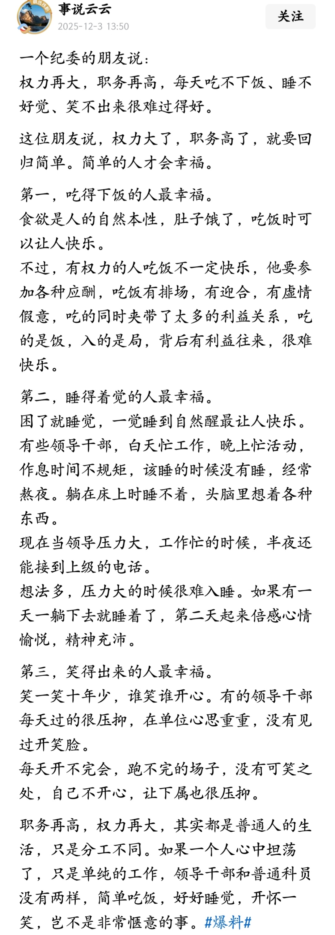 权力再大,职务再高,每天吃不下饭、睡不好觉、笑不出来很难过得好。