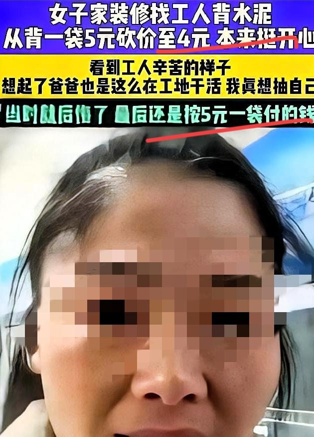 河南一女子装修雇老人扛水泥,把5块一袋压到4块,看老人满头汗爬五楼扛完30袋,她当场掏200块塞过去,说“叔,对不起,我占便宜了”视频里老人手都是抖的,还点头说谢谢,网友刷到直接破防。 50公斤的水泥扛上五楼,三十袋就是来回三十趟,白发老人每一步都喘着粗气,汗把衣服浸得透湿。这哪是干活,分明是拿老骨头换活命钱。 女子掏200块补差价的瞬间,不是多慷慨,是守住了最基本的共情。我们总爱为蝇头小利计较,却忘了体力劳动者赚的每一分,都带着实打实的辛苦。 砍价是人之常情,但体谅才是底色。对靠力气谋生的人多份厚道,不是慈善,是对他人尊严的尊重,也是给自己的良心留余地。 你遇到靠体力赚钱的劳动者,会主动多给报酬还是按价结算?
