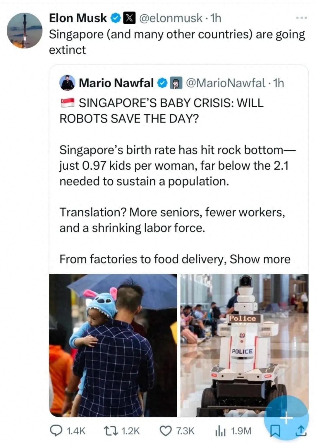 新加坡要被印度移民吞没?马斯克去年就发出“亡国警告”:“新加坡(和其他许多国家)快灭绝了。” 马斯克在X平台的一句“新加坡(和其他许多国家)快灭绝了”,直接掀起全球讨论热潮,国内更是传出“新加坡要被印度移民吞没”的惊悚说法。 不少人看到这句警告就忍不住联想,是不是印度移民在新加坡占比越来越高,快要取代本土族群了? 其实把移民和“亡国”直接画等号,完全是误读了马斯克的核心意思,也没看透新加坡人口问题的本质。 真正让这位商界大佬忧心、让新加坡陷入焦虑的,根本不是移民涌入,而是长期低迷的生育率和快速老龄化带来的人口结构崩塌风险。 一个国家要是没人愿意生孩子,光靠移民填补缺口,最终只会陷入文明延续的困境。 新加坡的情况只是这个全球趋势的缩影,只不过它是城市国家,人口基数小,问题显得更突出而已。 新加坡2024年的总生育率只有0.97,这意味着平均每个女性一辈子只生不到1个孩子,而维持人口稳定更替需要的生育率是2.1,连一半都没达到。 更严峻的是,这个数字已经持续低迷几十年,从1976年开始就没达到过更替水平。 要是没有外来人口补充,新加坡的本土劳动力会快速减少,养老金、医疗体系都会不堪重负,社会运转都成问题,这才是马斯克说“灭绝”的真正含义。 那为什么会有“印度移民吞没”的说法?主要是新加坡为了缓解劳动力短缺,长期靠移民补充人口,而印度裔移民的增长速度确实比较显眼。 根据中华人民共和国外交部2025年11月发布的新加坡国家概况,新加坡公民和永久居民中,华人占74%左右,其余为马来人、印度人和其他种族。 虽然印度裔占比不算高,但和2015年相比有明显提升,而且在高端领域存在感很强。 2023年还有印度裔候选人当选新加坡总统,这就让部分人产生了“被取代”的担忧。 而且新加坡的外来人口里,除了印度裔,还有大量泰国、菲律宾、缅甸等国的移民,形成了“小泰国”“小缅甸”这样的聚居区,真正改变新加坡族群结构的是整个外来群体,不是单一的印度裔。 这种“移民驱动增长”的模式,是新加坡没办法的选择——本土生育率上不来,老龄化又严重,不吸引外来人才,经济就会停滞。 虽然马斯克的“灭绝”说法有点夸张,但背后的逻辑是成立的——一个国家的延续,核心是人的延续,要是长期没人生孩子,再有钱、再发达,最终也会失去活力。 人口问题从来不是单一的“移民多少”或者“生育率高低”的问题,而是和经济发展、民生保障、社会观念紧密绑在一起的。 新加坡的例子就说明,光靠移民补充劳动力只能解燃眉之急,没法从根本上解决文明延续的问题。 毕竟移民群体的融入需要时间,还可能带来文化、族群之间的摩擦。 其次,发达经济体普遍面临低生育率困境,这说明经济繁荣不一定能带来人口稳定,反而可能因为生活成本上升、个人主义盛行,让人们不愿意生育。 这一点对我们也有借鉴意义,中国现在也面临生育率下降和老龄化的挑战。 最后,看待不同国家的人口政策,不能用“非黑即白”的眼光。 新加坡的移民政策有其合理性,确实缓解了短期的劳动力短缺,保持了经济竞争力;但它的局限性也很明显,没法解决长期的人口更替问题。 每个国家的国情不同,人口基数、文化传统、发展阶段都不一样,适合的解决方案也必然不同。 关键是要找到“经济发展”和“人口可持续”的平衡点,既要让年轻人有能力、有意愿生孩子,也要让外来人才能够更好地融入社会,形成多元共生的格局。 马斯克的警告更像是一记警钟,提醒所有国家重视人口问题——文明的延续不是靠高楼大厦和高科技,而是靠一代又一代的人传承。 【评论区聊聊】新加坡不会被印度移民吞没,也不会轻易“灭绝”,但它面临的人口困境,值得每个国家深思。 (信源:马斯克提出“人口灭绝论”,有些国家肯定比新加坡还慌……——新加坡眼)