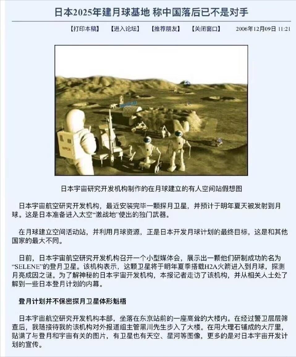 今天是日本建立月球基地的最后一天! 今天是2025年的最后一天,也是日本在2006年高调宣布的“登月建立基地”的截止日。 现在抬头看看夜空里的月亮,那里没有日本的基地,甚至连一个能稳定工作的日本设备都找不到。 这场持续近20年的太空豪言,最终以悄无声息的落空收尾,背后藏着的不只是一个国家的航天梦碎,更暴露了国际太空竞争里最真实的生存法则。 大家可能不知道,2006年的日本在航天领域野心有多足。 当时他们刚整合了三个顶尖航天机构,成立了拥有3000多名研究员、400位博士的宇宙航空研究开发机构,还在全球多地设了办事处。 面对神舟六号的成功,日本航天机构负责人直言不讳:中国的飞速发展给了他们很大刺激,甚至把中国当成了主要竞争对手。 媒体更是高调夸耀自家卫星比中国、印度的个头大、精度高,仿佛月球基地已是囊中之物。 那时的日本不仅喊出了2025年建月球基地的目标,还规划了详细的技术路径:先搞月面软着陆,再派探测器收集数据,最后实现有人驻留。 可理想有多丰满,现实就有多骨感。 从1990年第一次探月任务卫星失控坠毁,到2025年“坚韧”号着陆器硬着陆溅出16米大坑,三十多年里日本探月七连败,连最基础的软着陆都没彻底搞定,就更别说建基地了。 就说今年失败的“坚韧”号,问题出得让人哭笑不得。 高度计出现异常,直接错过了减速时机,说白了就是关键设备没扛住月球近300℃的极端温差。 后来才知道,这台美制激光测距仪压根没经过月球环境测试,他们就想把工业级仪器直接搬到太空用,这种技术投机最终付出了惨痛代价。 更核心的问题是日本探月技术体系的“万国牌”困境,70%的电子元件依赖进口,导航软件是美日混合开发,连发射都得靠美国SpaceX的火箭。 这种拼凑出来的技术架构,兼容性问题频发,就像用不同品牌的零件攒出来的汽车,跑起来迟早出故障。 反观中国嫦娥三号的同类设备,经过2000次高低温循环测试,才能稳稳当当在月面着陆,这就是踏实研发和投机取巧的差距。 战略上的朝三暮四更是致命伤,1996年说30年内建月球基地,2005年规划2015年发射月球机器人,2025年建载人飞船,这些目标一个个都成了空谈。 最新又改成2030年“傍着美国”登月,想靠参与美国主导的太空港项目蹭上月球,可美国自己的预算都砍了60亿美元,连原定的月球轨道空间站都可能取消。 日本这个“搭车计划”能不能成,还是个未知数。 财政上的捉襟见肘也让计划难以为继,日本航天年度预算只有约13.4亿美元,不到美国NASA的十分之一,连维持基础研发都费劲,更别说支撑月球基地这种烧钱的大项目。 其实不止日本,月球基地从来都不是随便喊喊就能实现的。 光一个月壤砖,就需要反复测试配方和寿命,还得建月球工厂批量生产,更别说多次发射运输物资、降低地月运输成本这些难题。 这些都需要长期稳定的投入和技术积累,不是靠一时冲动就能实现的。 太空探索从来没有捷径,更容不得半点投机取巧,日本总想走“拿来主义”的捷径,依赖进口零件和外国技术,结果就是核心技术卡脖子,关键时刻掉链子。 而中国航天之所以能稳步前进,从嫦娥探月到月壤打砖机器研制成功,靠的就是自主创新,一步一个脚印地攻克技术难关,这种踏实做事的态度,才是航天探索的根本。 国家重大战略需要长期定力,近20年里日本航天目标换了一个又一个,政策摇摆不定,资源和精力都被分散。 国际太空竞争的本质是综合国力的比拼,航天领域的每一点进步,都需要强大的经济实力、工业基础和人才储备做支撑。 太空是全人类的共同财富,探索月球的目的不是为了争夺霸权,而是为了拓展人类的认知边界,造福全人类。 日本的失败案例提醒我们,任何宏大的太空梦想,都必须建立在脚踏实地的研发和长期稳定的投入上,投机取巧、急功近利最终只会竹篮打水一场空。 【评论区聊聊】只有坚持自主创新、保持战略定力、秉持开放合作,才能在太空探索的道路上走得更远更稳。 (信源:日本欲2025年建月球基地 官员称中国已落后——北方网)