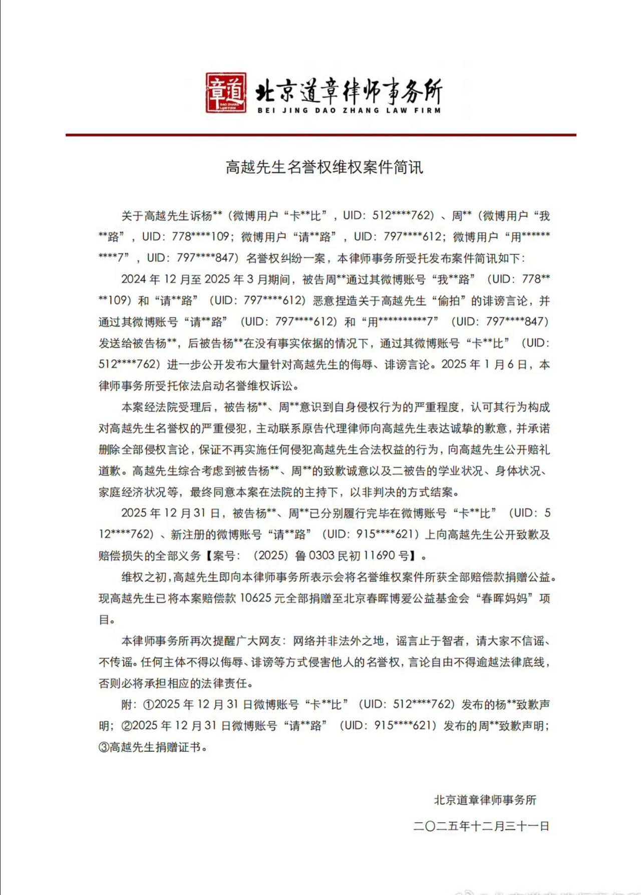 ​​​说还是告名誉权的你搞清楚,但凡学了一点都知道名誉权侵权是更宽泛的法律概念,诽谤是侵害名誉权的典型行为之一,简讯明确将被告的“诽谤言论”列为侵权行为,证明这不是单纯的名誉权侵权,而是以诽谤为手段的名誉权侵权,直接证明了诽谤事实的存在。不要说法学生,高中选修过政治的都应该知道吧?还在浑水摸鱼,混淆概念的,非蠢既坏。 而且《民法典》关于名誉权侵权的法定标准判定,不会因被告的学业、身体、家庭状况做灵活调整,是越子选择了以非判决形式结案,没让他们留底,赔偿的💰都捐出去了,还因为这个被骂捐得少,没告到你头上是吧?真的蠢到家坏到家了