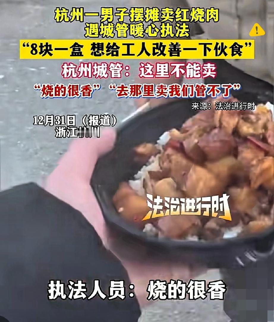 杭州城管这波操作太圈粉了! 谁说执法只能冷冰冰? 这几句暖心话才是城市该有的温度! 8块钱一份的满满当当红烧肉,是摊主对工地工人的体恤;笑着提醒“去工地里卖”,是城管对生计的体谅。 没有生硬驱赶,没有刻板说教,既守住了城市管理的底线,又给了普通人谋生的体面。 其实城市治理哪有那么多“非黑即白”? 真正的智慧从来不是“一刀切”,而是在规则与人情之间找到平衡点。 城管的暖心提醒,摊主的积极配合,这双向的理解才是最动人的默契。 这样的执法不是“放水”,而是带着同理心的精准施策,让城市既有秩序感,又不失烟火气。 你身边有没有遇到过这样温暖的执法瞬间?来评论区分享一下~