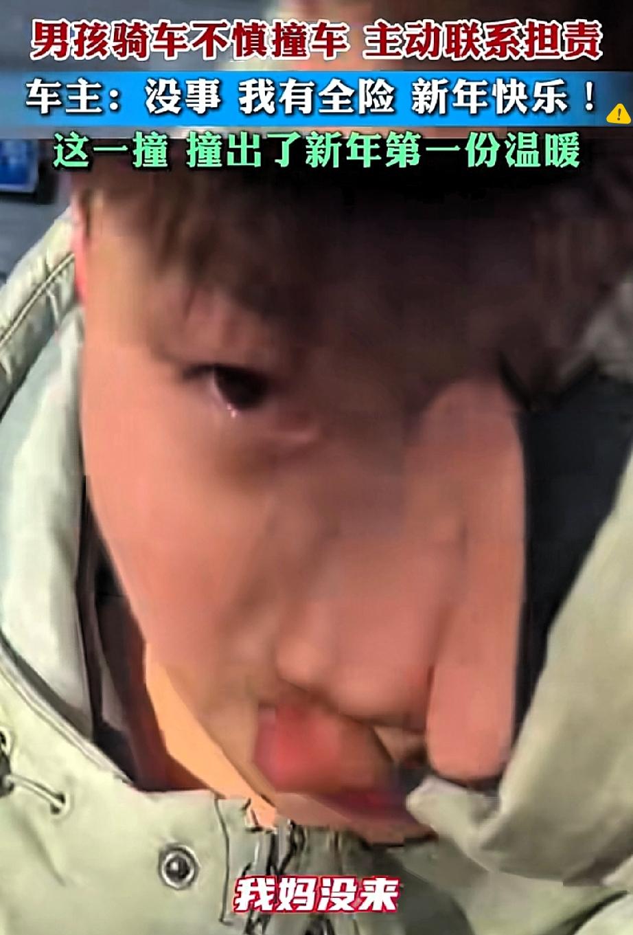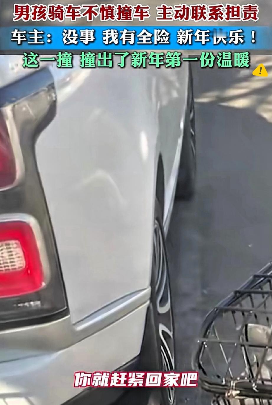 这一撞撞出的温暖,才是新年最珍贵的礼物啊!原来真诚与包容撞在一起,能开出这么温柔的花! 男孩骑车撞上奥迪后没有跑,反而主动联系车主担责,这份小小年纪的担当,比什么都可贵。 而车主一句“我有全险,新年快乐”,轻轻化解了男孩的慌张,没有指责只有体谅,把成年人的温柔展现得淋漓尽致。 其实生活里的美好从不是惊天动地的大事,而是这份“你敢负责,我愿包容”的双向奔赴。 男孩的诚实守住了做人的底线,车主的宽容传递了人间的善意,这样的瞬间,让冰冷的事故变成了暖心的故事。 你有没有遇到过这样被陌生人的善意温暖到的时刻?来评论区分享一下吧~