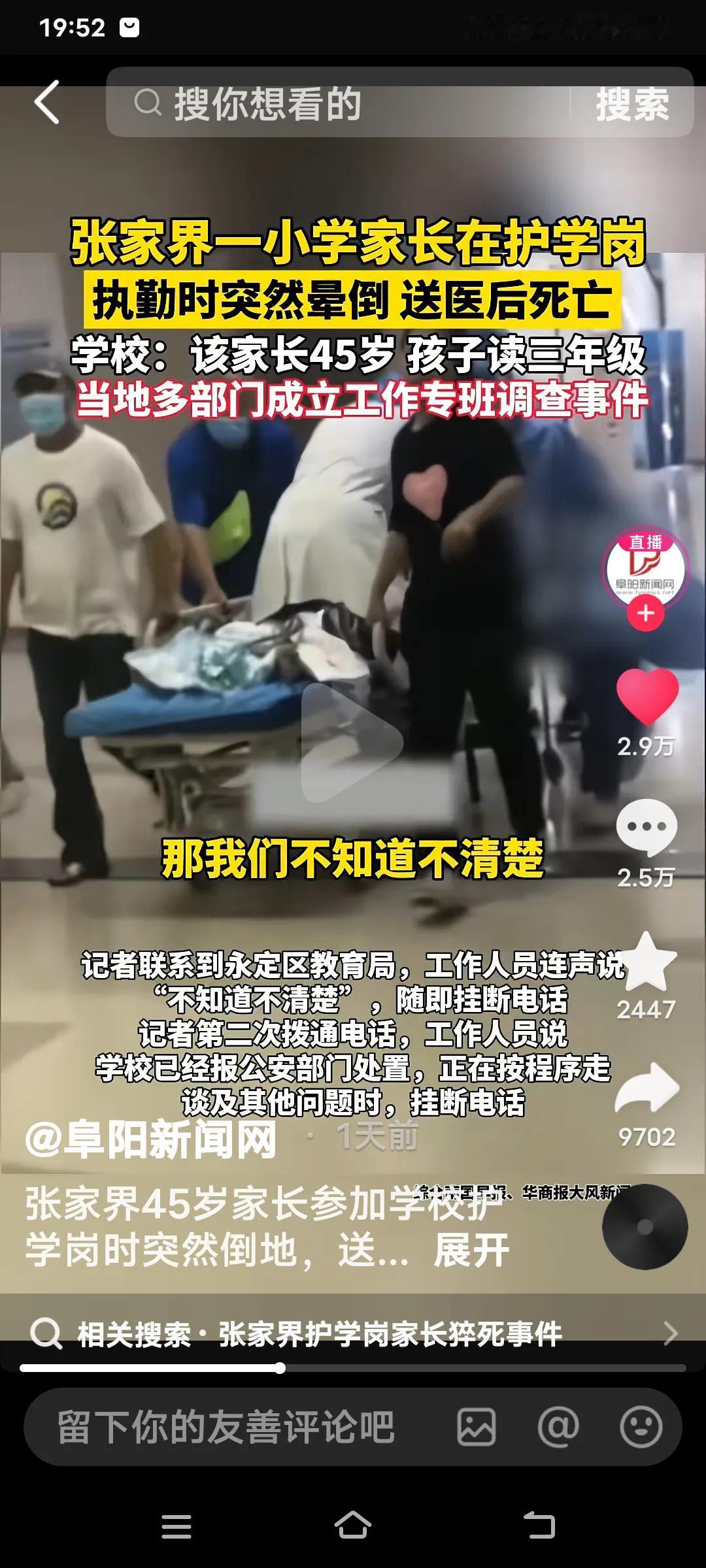 张家界家长护学岗猝死事件引发了广泛关注,目前调查进展成了大众关心的焦点。 学校:这位家长年仅45岁,孩子才上三年级,这时间实在太不巧了,眼看就要过年了真让人痛心。记者联系到永定区教育局工作人员,对方称:“我们不知道也不清楚,清楚的话就和你们说了。”随后便挂断了电话。 当地多部门已成立工作专班对该事件展开调查。毕竟家长是在护学岗上离世的,学校难辞其咎,赔偿是必然的。 就算家长此前患有疾病,学校也不能不给予赔偿,学校这次算是倒了大霉。“家长护学岗”?我还是头一回听说,如今看来真是得不偿失,双方都陷入了不幸的境地。 校园猝死