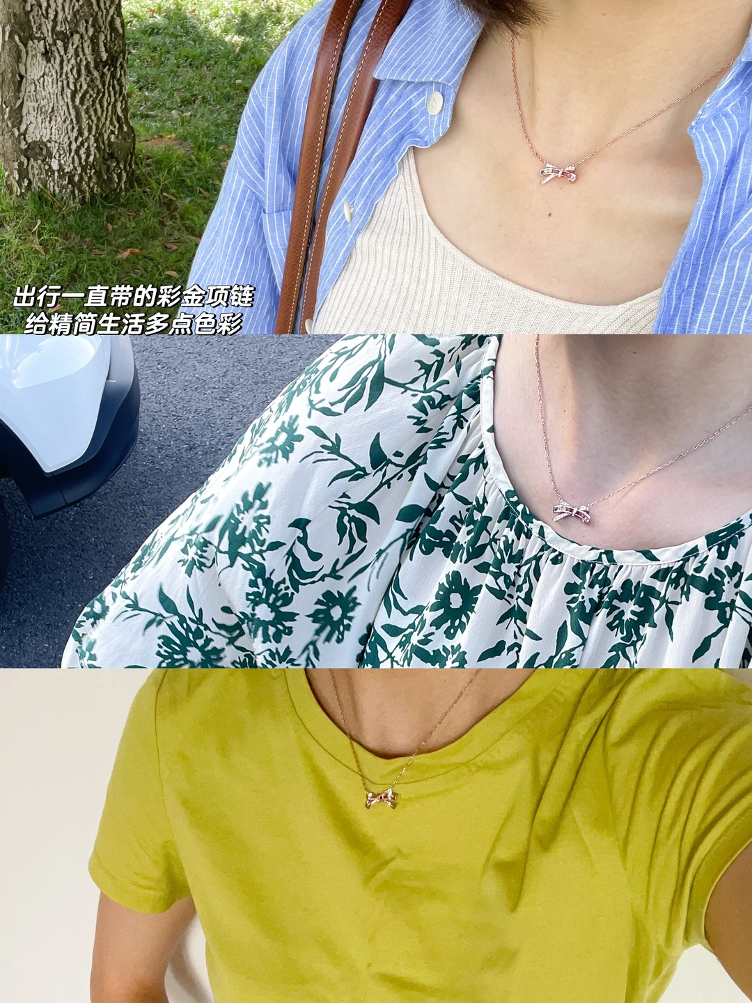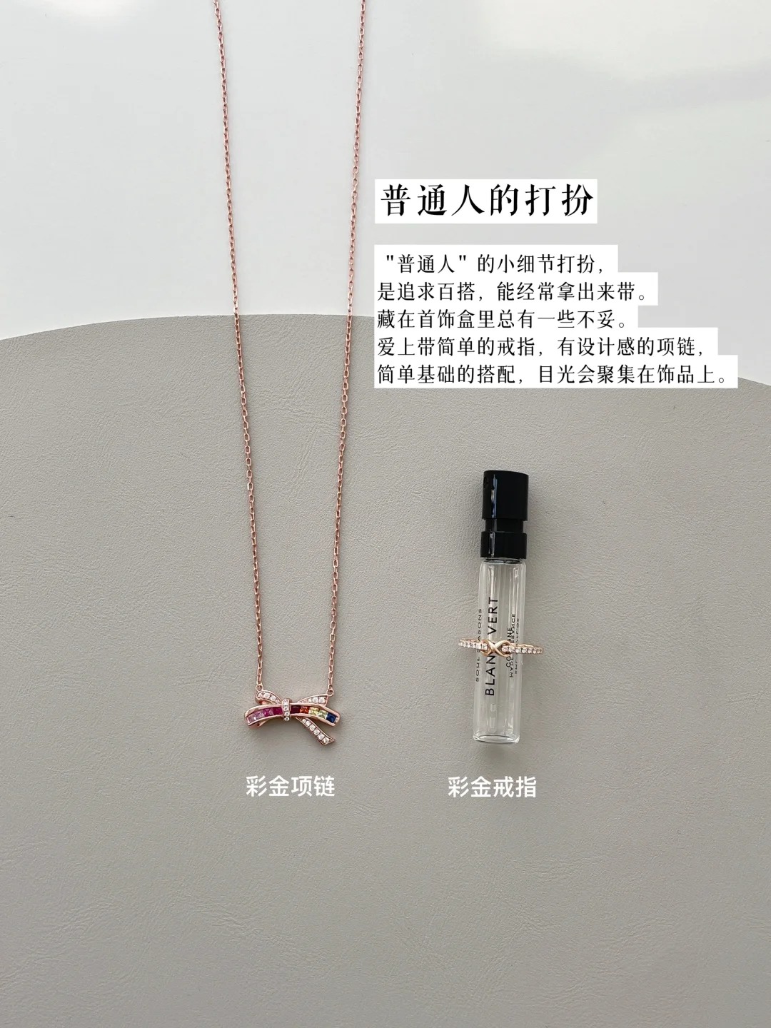 “普通人”的饰品,是追求百搭,能经常拿出来带。藏在首饰盒里总有一些不妥。爱上带简单的戒指,有设计感的项链,简单基础的搭配,目光会聚集在饰品上。旅行时我一直带的彩金项链,简单的穿搭下突出小小的“精致感”。