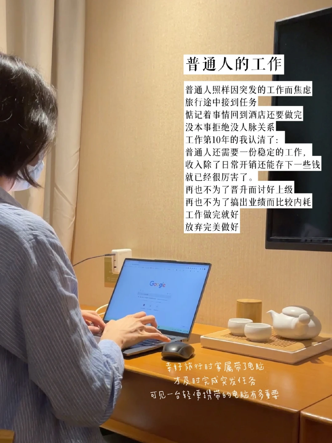 普通人照样因突发的工作而焦虑。旅行途中接到任务,惦记着事情回到酒店还要做完,没本事拒绝没人脉关系,那就乖乖完成就好。职场没有眼泪只要结果。