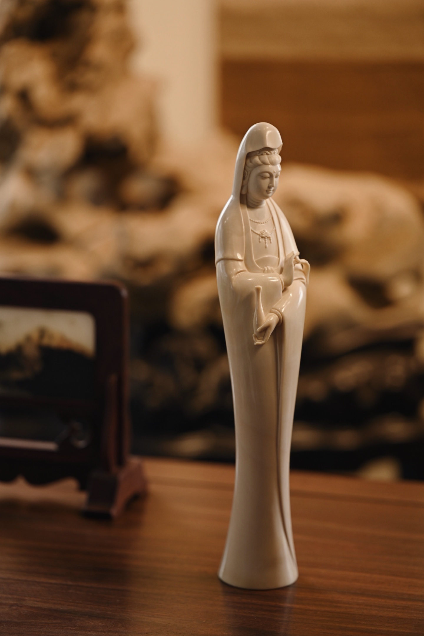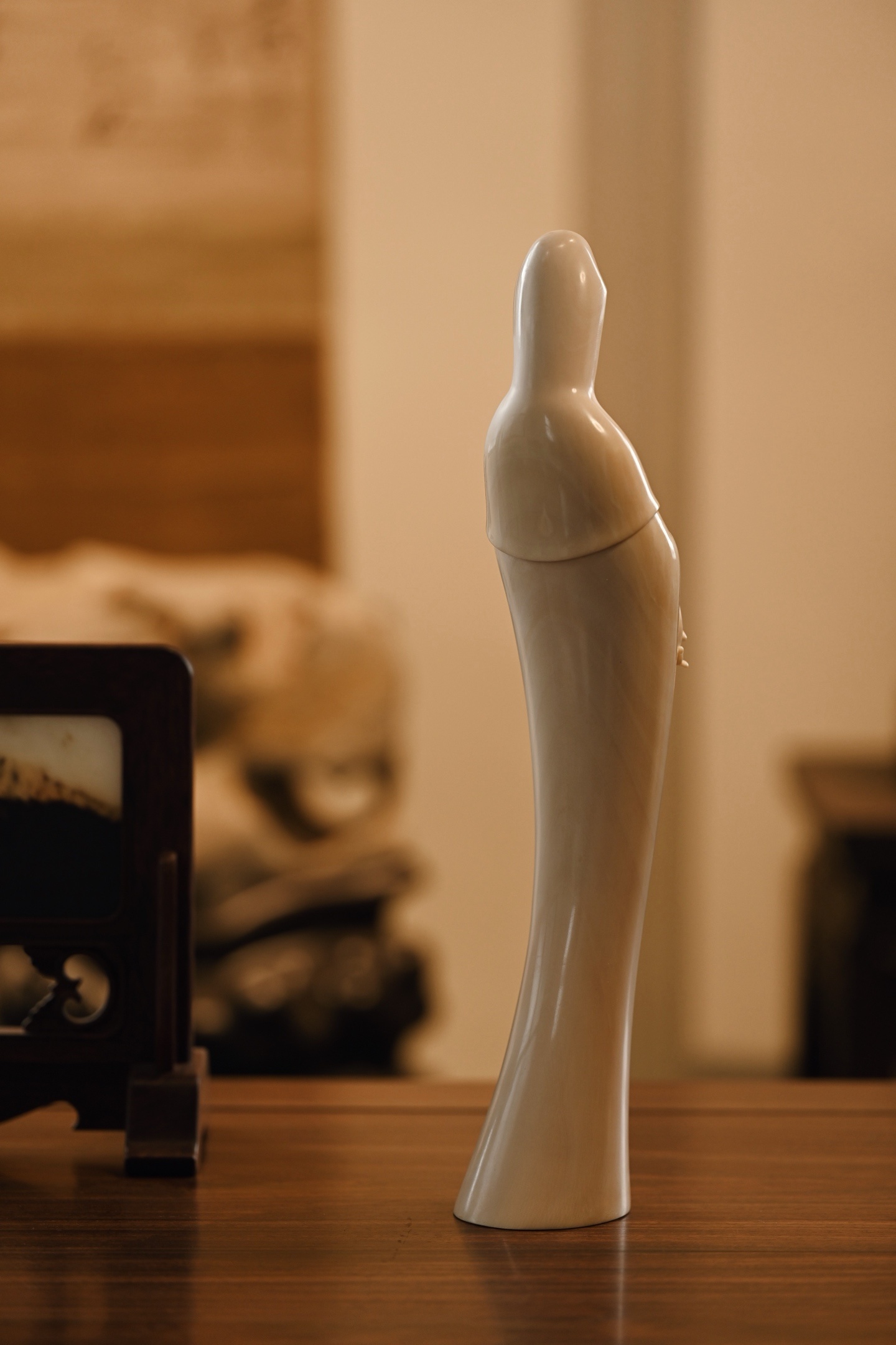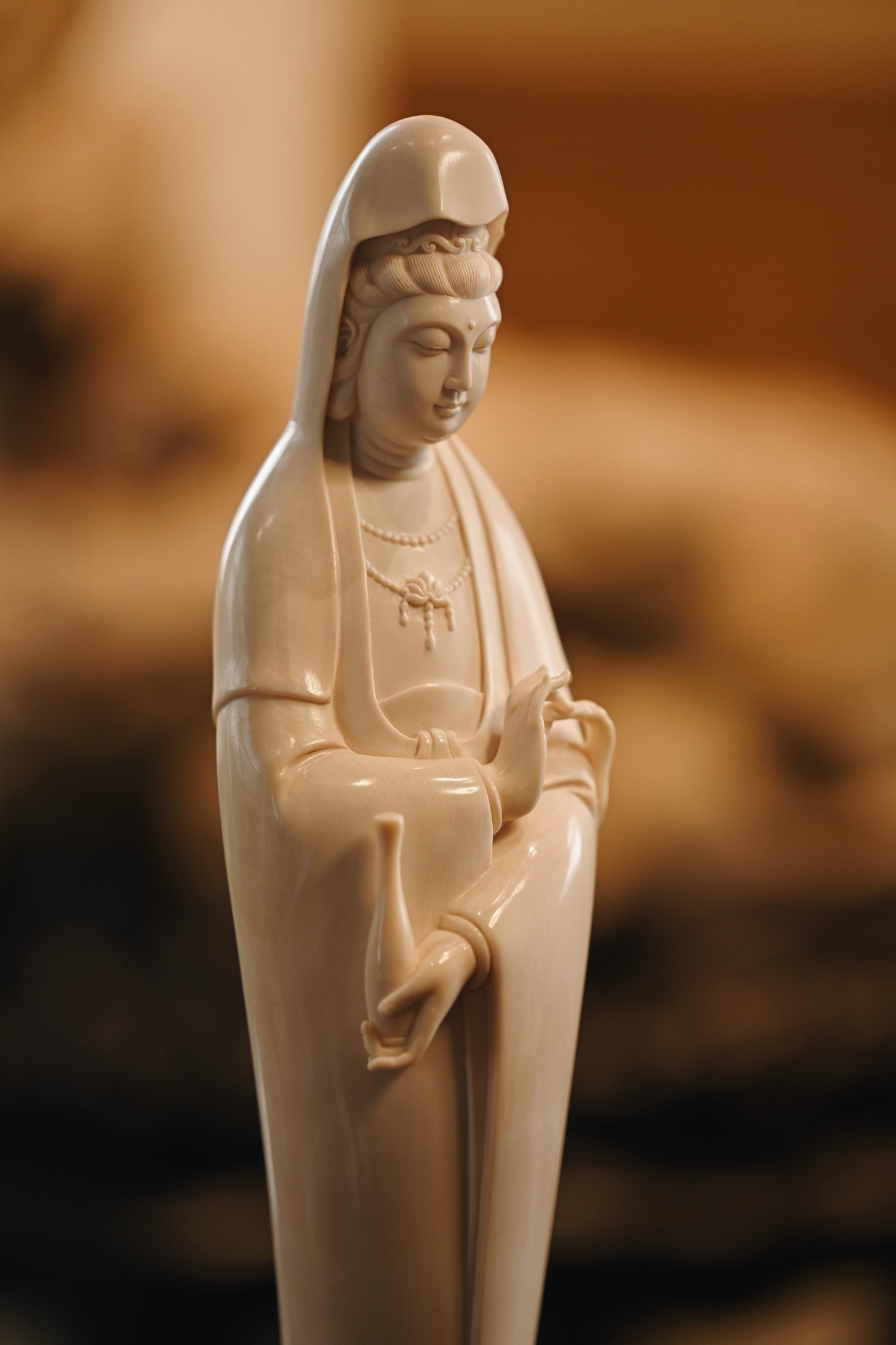 猛犸 | 杨柳观音 料质凝润,雕刻观音立姿,面容丰腴,高眉垂目,微带笑意,手持柳枝、净瓶,宝衣贴体,有曹衣出水之韵,庄严殊胜。6.2*6*32cm 795g