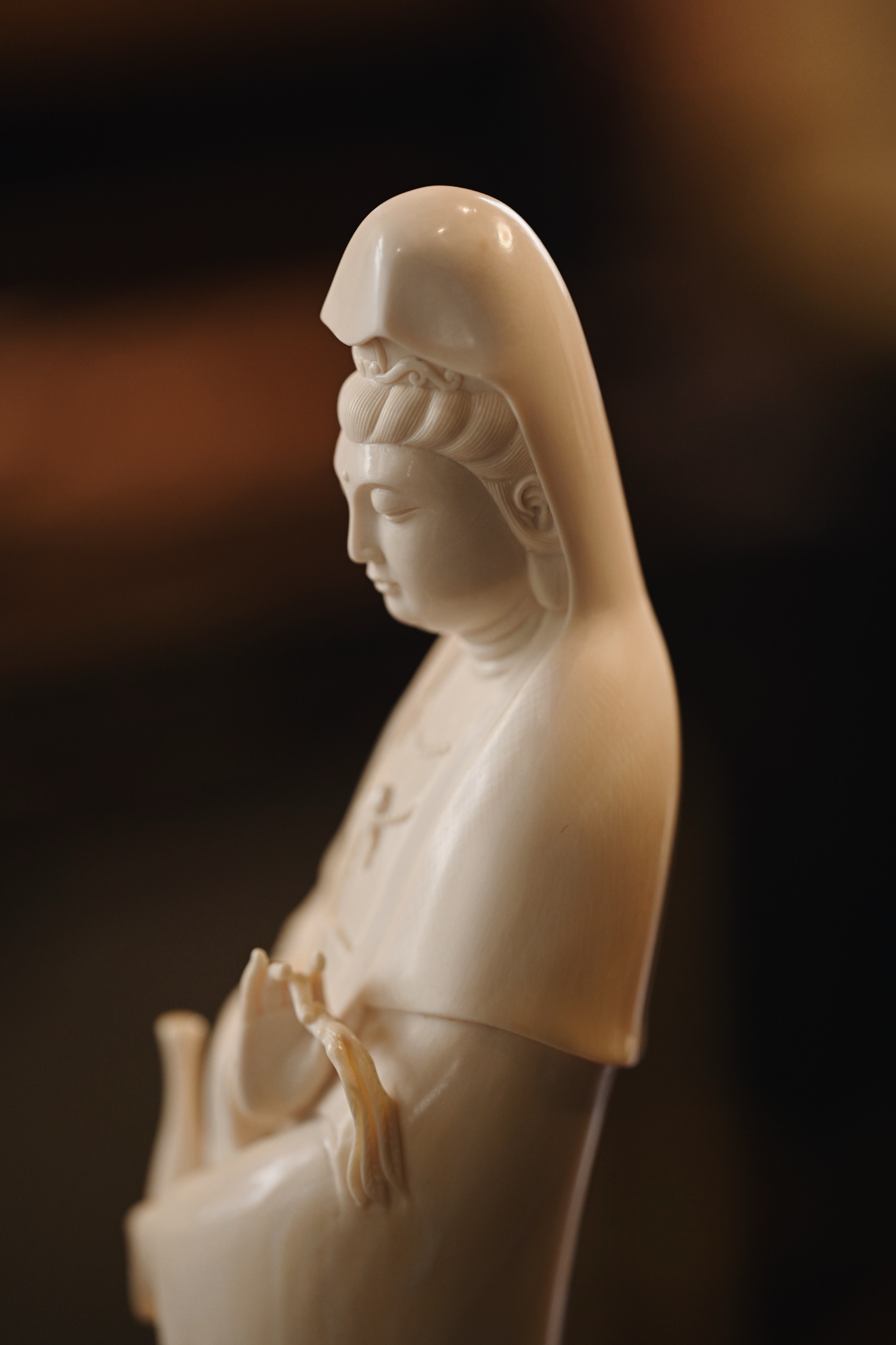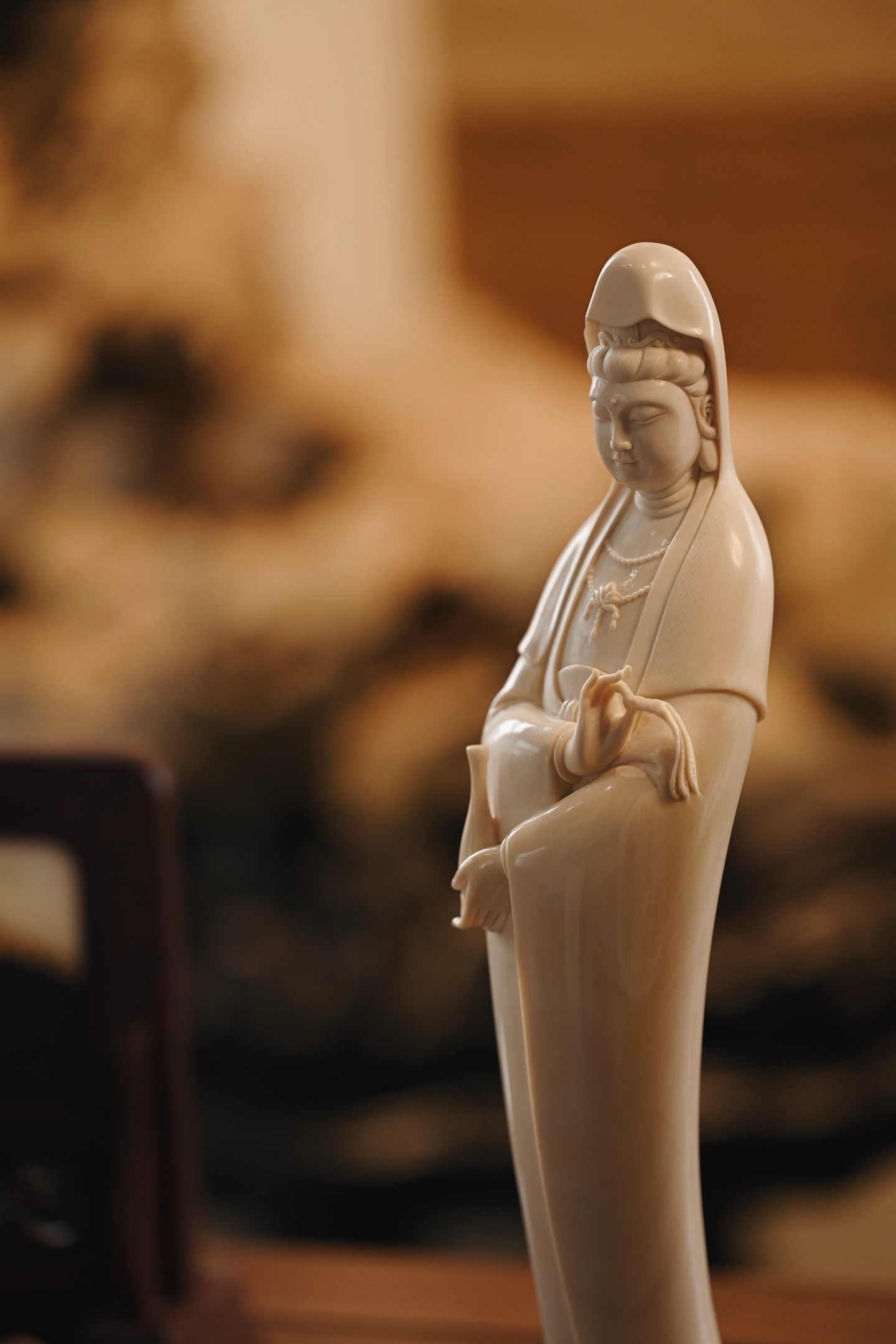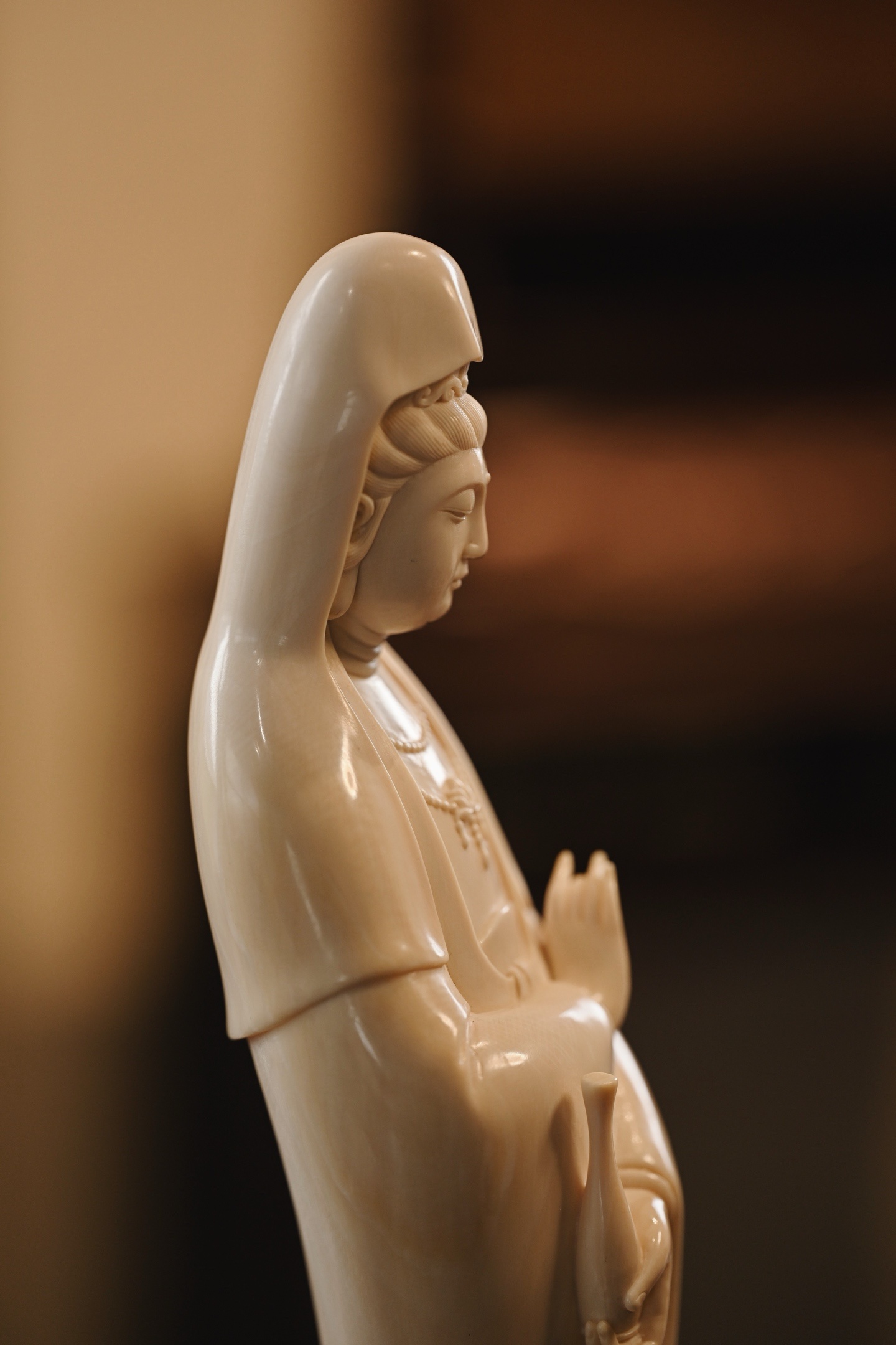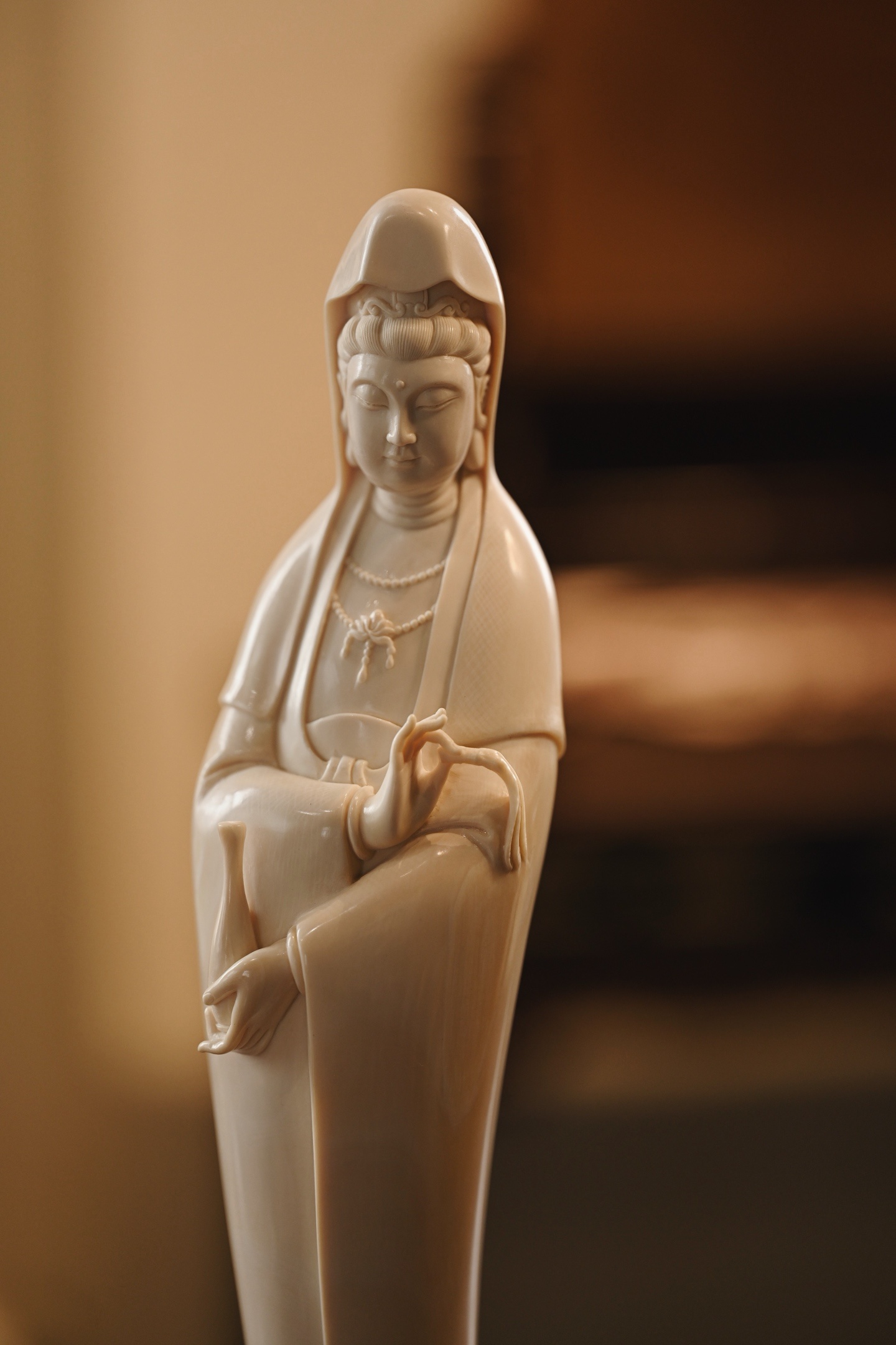 猛犸 | 杨柳观音 料质凝润,雕刻观音立姿,面容丰腴,高眉垂目,微带笑意,手持柳枝、净瓶,宝衣贴体,有曹衣出水之韵,庄严殊胜。6.2*6*32cm 795g